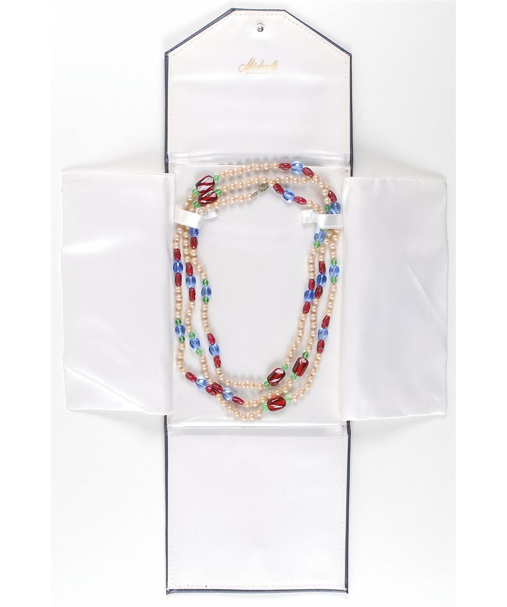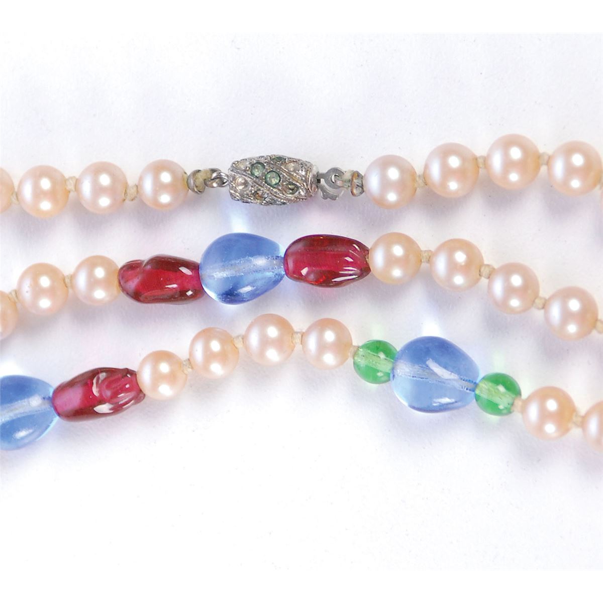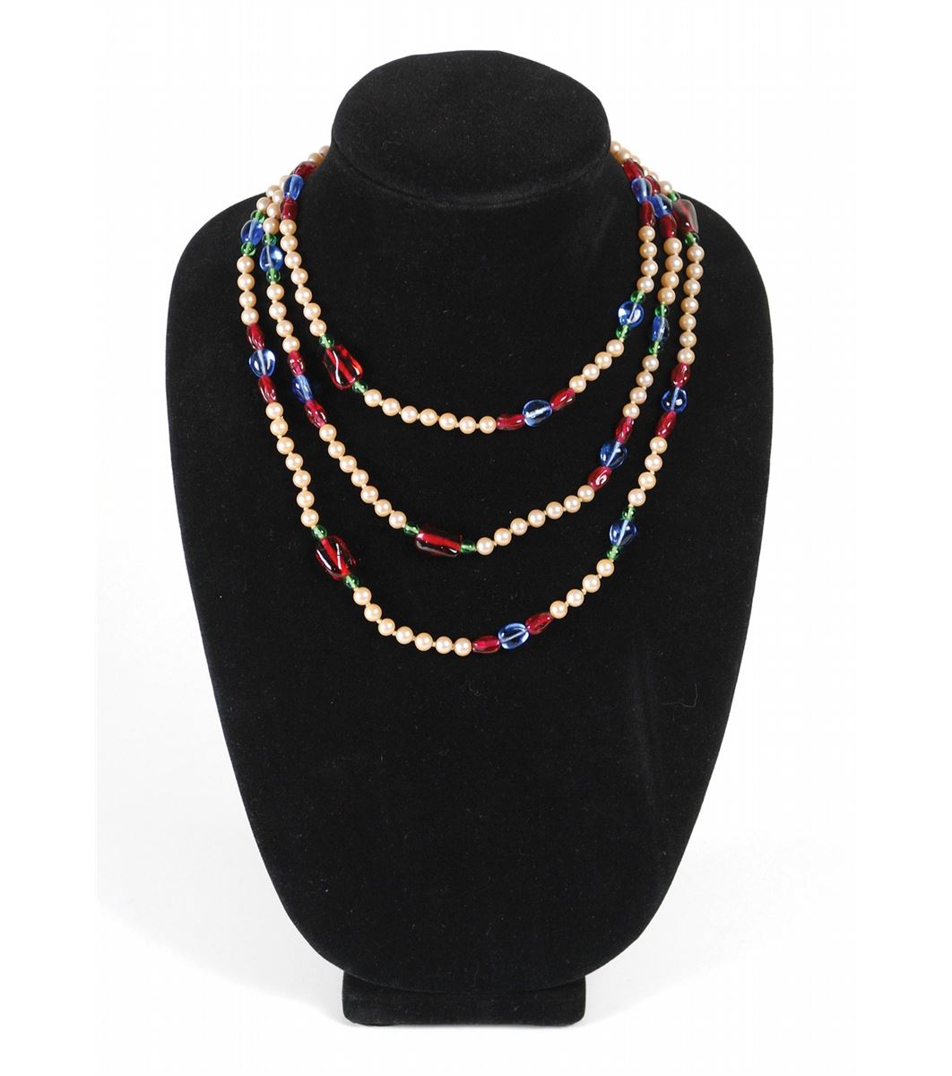 The Duchess of Windsor’s personally owned beaded necklace of a lovely design, measuring 60? inches long, featuring strings of faux pearls separated by blue, red, and green beads. In fine condition. Originates from the Christie’s 2004 sale in Rome, which comprised the property of the Duke and Duchess gifted to her personal assistant, Ophelia Sanegre Belini. Few pieces of jewelry were offered in the sale, making this necklace even more appealing.