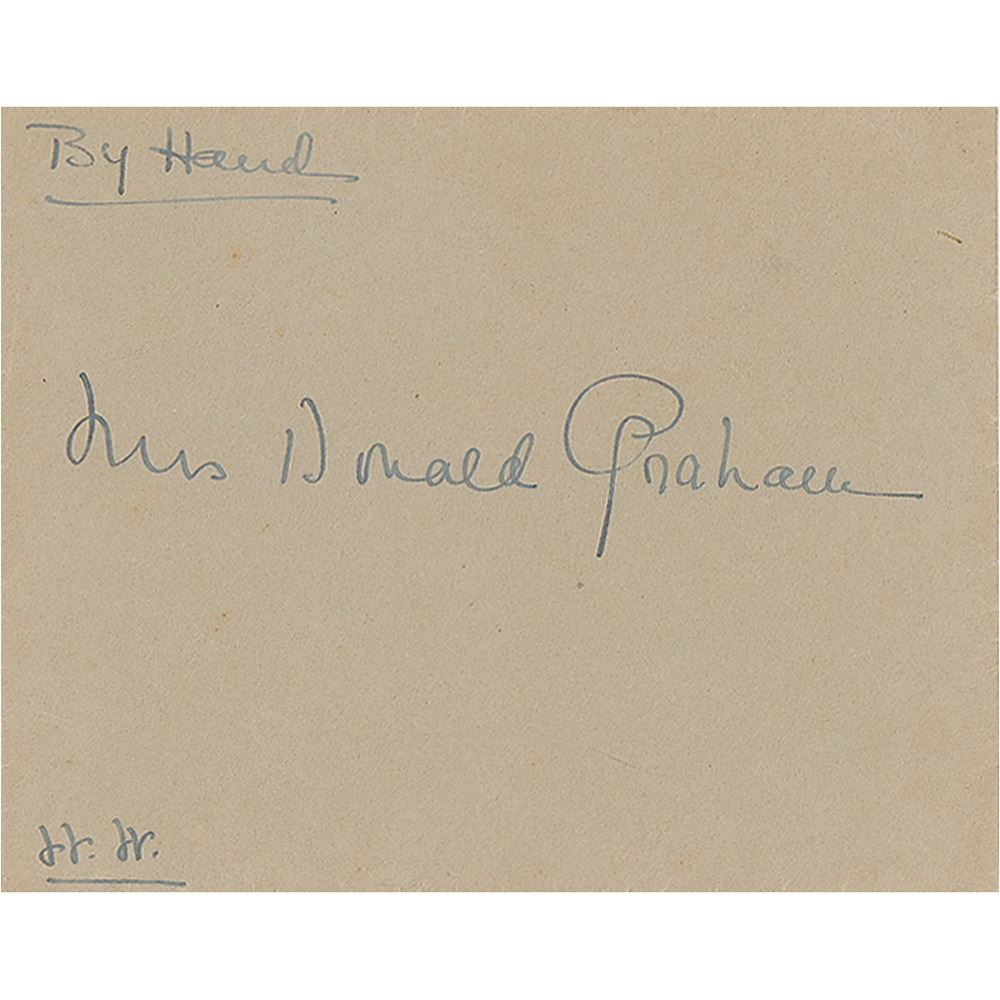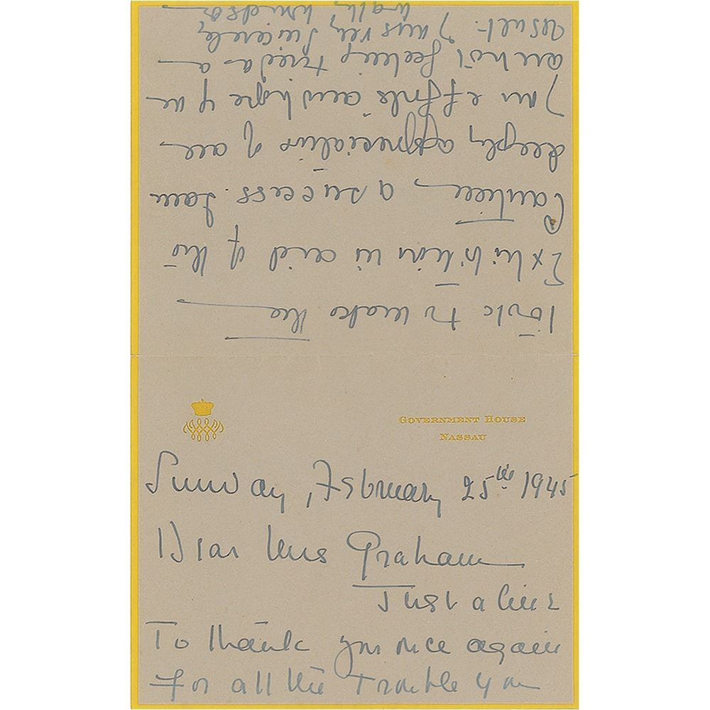 ALS signed “Wallis Windsor,” two pages on two adjoining sheets, 5.25 x 4, Government House, Nassau letterhead, February 25, 1945. Letter to Mrs. Donald Graham, in full: "Just a line to thank you once again for all the trouble you took to make the exhibition in aid of the canteen a success. I am deeply appreciative of all your efforts and hope you are not feeling tired as a result." In fine condition. Accompanied by the original mailing envelope, addressed in her own hand and signed with her initials in the lower left, "W. W."