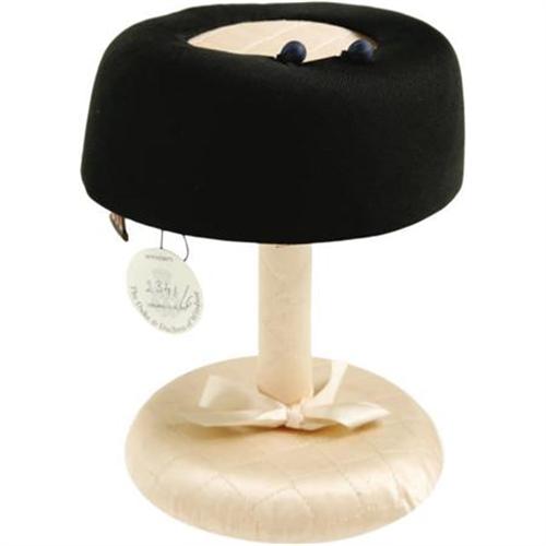 <B>Wallis Simpson, Duchess of Windsor, Owned Pillbox Hat.</B></I> A chic black jersey-covered pillbox hat owned by Wallis Simpson, Duchess of Windsor. The open-crown hat was custom-made for the Duchess by Bergdorf Goodman, and was previously auctioned at Sotheby's (auction tags still attached). In Excellent condition with a Bergdorf Goodman tag along lining and two hatpins. Accompanied by the Duchess' silk-covered hat stand. A refined and tasteful reflection of the stylish royal.<BR><BR><b>Shipping:</b> Clothing, Costumes & Jerseys (<a target="_blank" href="http://www.heritageauctions.com/common/shipping.php">view shipping information</a>)