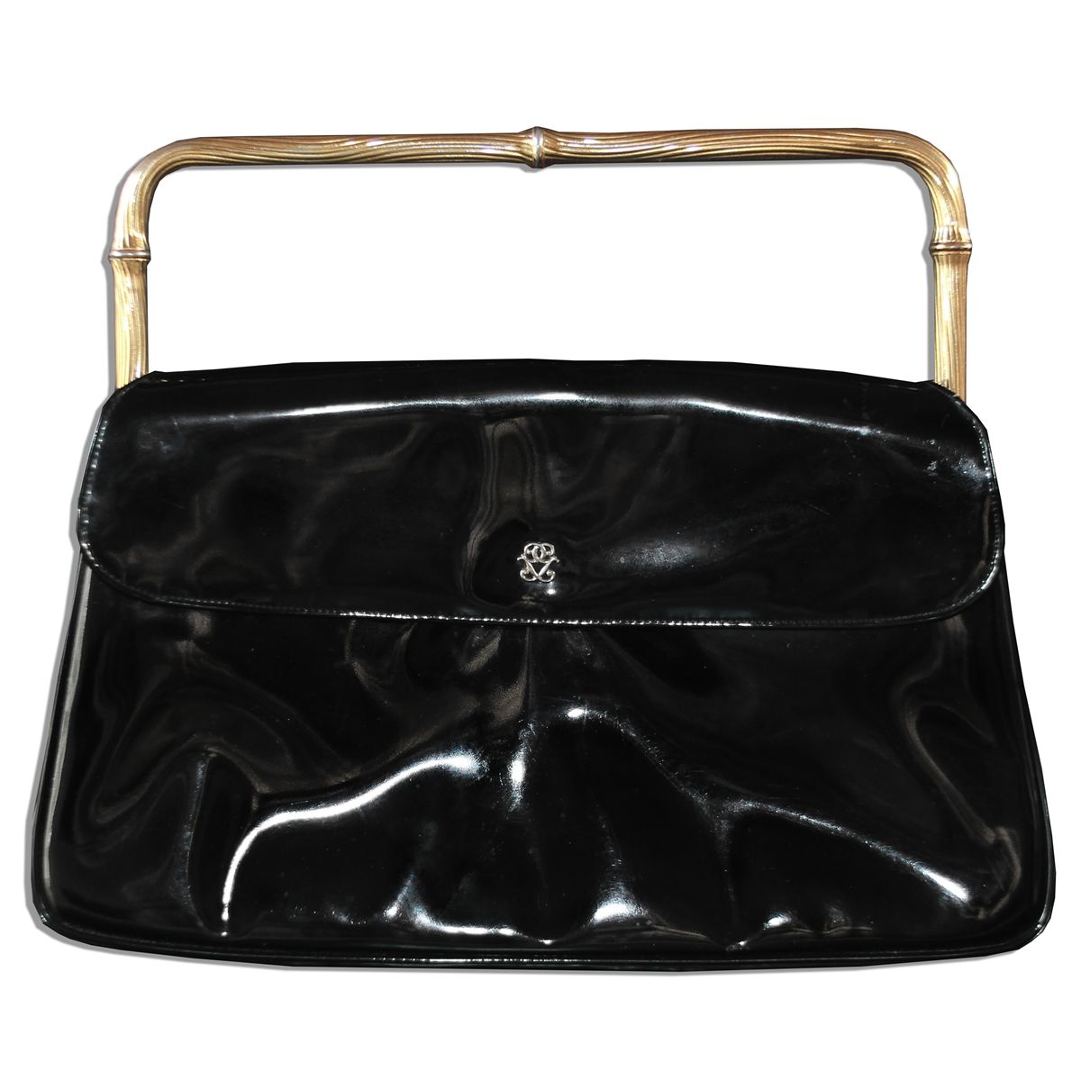 Black patent handbag personally owned by Wallis Simpson, the Duchess of Windsor. High-gloss bag features an applied gold tone metal decoration over the clasp and matching bamboo-shaped handle that retracts to transform the bag into a large clutch. Purse by Koret brand is marked inside with the brand name and logo and noted, ''Not A Leather'', with an additional note inside the flap. Very good to near fine condition. Originally part of lot 2242 of Sotheby's ''The Duke and Duchess of Windsor'' sale, held 11-19 September 1997.