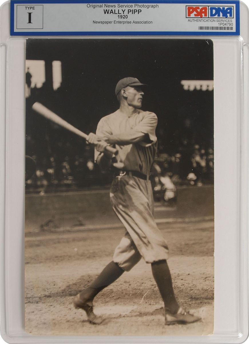 Unsigned original pearl-finish 6.5 x 10 Newspaper Enterprise Association press photo of Wally Pipp following through on a swing, stamp-dated September 30, 1920, on the reverse. Encapsulated in a plastic PSA/DNA authentication holder certifying it as a Type I original news service photograph. In fine condition, with light surface impressions from notations on the reverse. Accompanied by a full letter of authenticity from PSA/DNA. Pipp, the New York Yankees first baseman from 1915 to 1925, is best known as the man who lost his job to Lou Gehrig. On June 2, 1925, Pipp took a day off due to a headache and was replaced by a young Gehrig—who then went on to play in 2,130 consecutive games.