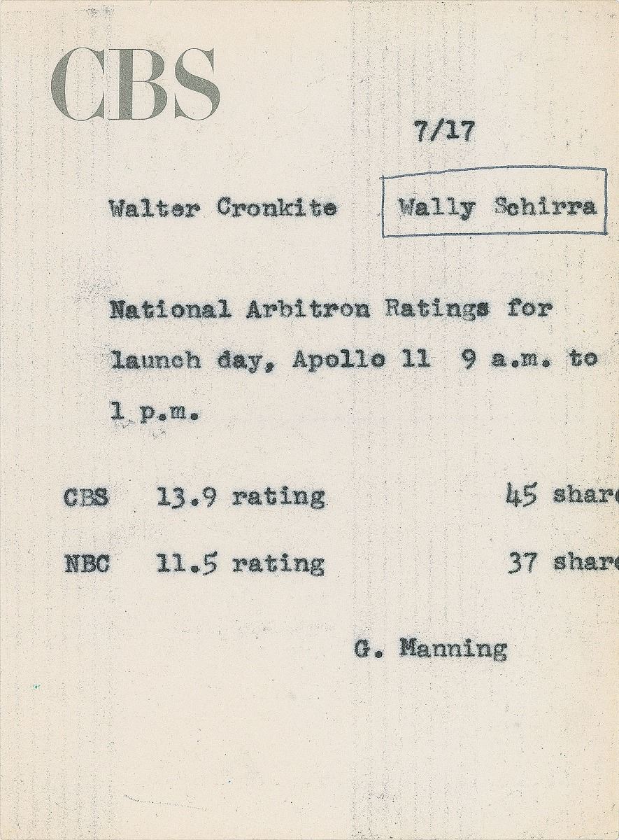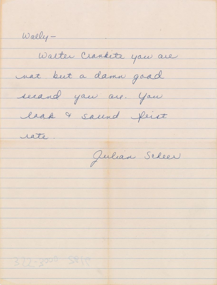 Three items: a glossy 10 x 8 photo of Wally Schirra sitting with Walter Cronkite during a CBS televised moon-landing special, signed in black felt tip, “Wally Schirra”; an ALS signed “Julian Scheer,” NASA’s longtime assistant administrator for public affairs, one page, lightly lined, 8.25 x 11, no date, written to Schirra, in full: “Walter Cronkite you are not but a damn good second you are. You look & sound first rate”; and a clipped 4 x 5.5 CBS ratings press sheet, in part: “National Arbitron Ratings for launch day, Apollo 11 9 a.m. to 1 p.m. CBS 13.9 rating, 45 shares.” In overall fine condition. Accompanied by a certificate of authenticity from PSA/DNA. The only astronaut to fly in the Mercury, Gemini and Apollo programs, Schirra would go on to team up with Walter Cronkite for all seven of the moon-landing specials aired on CBS. An appealing collection of items related to Schirra’s successful post-NASA career.