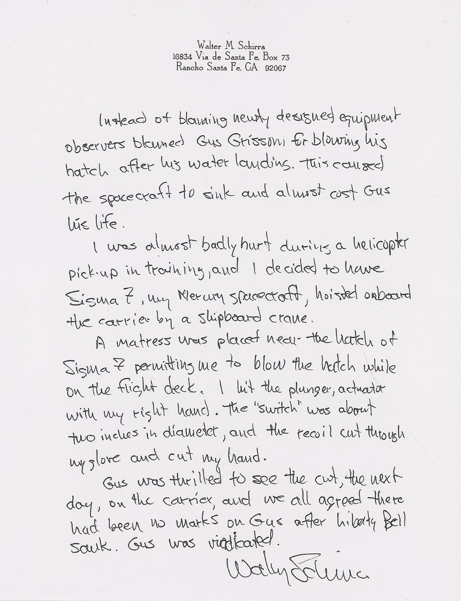 ALS, one page, 8.5 x 11, personal letterhead, no date. In full: “Instead of blaming newly designed equipment observers blamed Gus Grissom for blowing his hatch after his water landing. This caused the spacecraft to sink and almost cost Gus his life. I was almost badly hurt during a helicopter pick-up in training, and I decided to have Sigma 7, my Mercury spacecraft, hoisted onboard the carrier by a shipboard crane. A mattress was placed near the hatch of Sigma 7 permitting me to blow the hatch while on the flight deck. I hit the plunger, actuator with my right hand. The ‘switch’ was about two inches in diameter, and the recoil cut through my glove and cut my hand. Gus was thrilled to see the cut, the next day, on the carrier, and we all agreed there had been no marks on Gus after Libery Bell sank. Gus was vindicated.” In fine condition. Accompanied by a color satin-finish 10 x 8 composite photo of Schirra’s experiment with the hatch, signed in the lower border in black felt tip, “Schirra blows the hatch, Gus is vindicated! Wally Schirra,” adding his mission insignia next to his signature. Speculation over Grissom’s mishandling of the Liberty Bell 7 hatch was finally put to rest by fellow Mercury astronaut Schirra, whose experiment and subsequent hand injury during the Sigma 7 landing convinced NASA engineers that Grissom was indeed telling the truth, and that blame should be cast on the spacecraft’s faulty egress system.