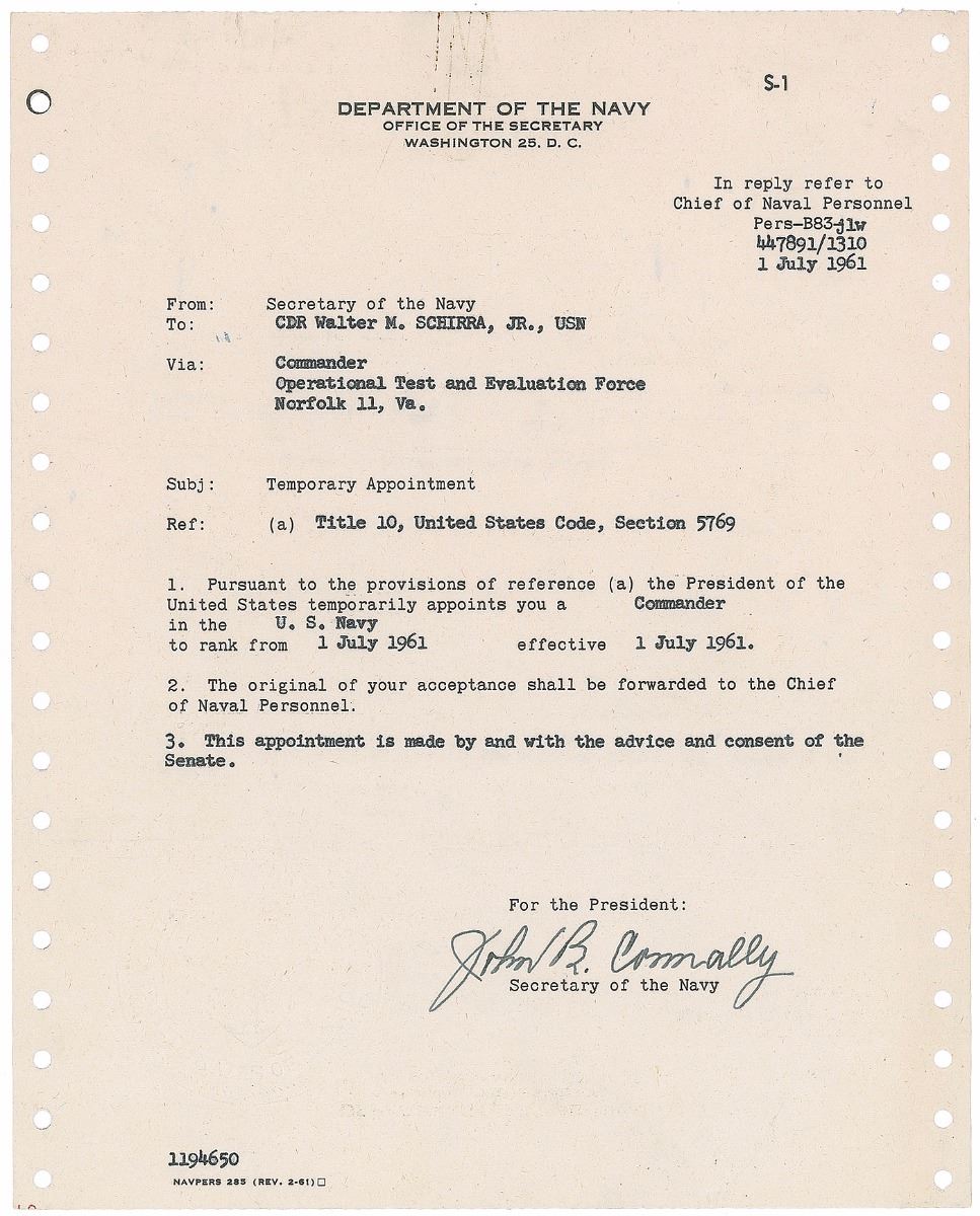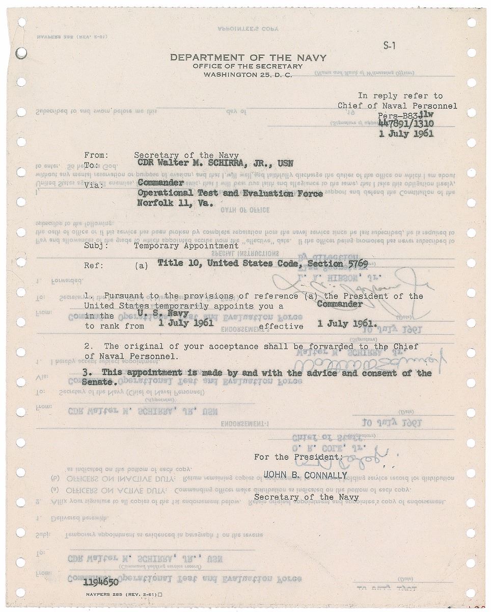 DS, signed “Walter M. Schirra, Jr.,” one page both sides, 8 x 10, July 10, 1961. Official Department of the Navy temporary appointment of Schirra as “a Commander,” signed in fountain pen by Schirra as well as Chief of Staff O. R. Cole, Jr., and Flag Secretary L. A. Hibson, Jr. Also includes a cover letter signed in autopen by Secretary of the Navy John B. Connally. In fine condition. Schirra had graduated from the US Naval Academy at Annapolis in 1945, when he was commissioned as an officer and served aboard the USS Alaska in the final months of World War II. He then served as a fighter pilot during the Korean War, followed by time as a military flight instructor and test pilot. He became one of the 110 military test pilots selected as astronaut candidates in 1959, ultimately passing the grueling testing and training processes to become one of NASA’s famed Mercury Seven. From the collection of aerospace memorabilia specialist Ken Havekotte.
