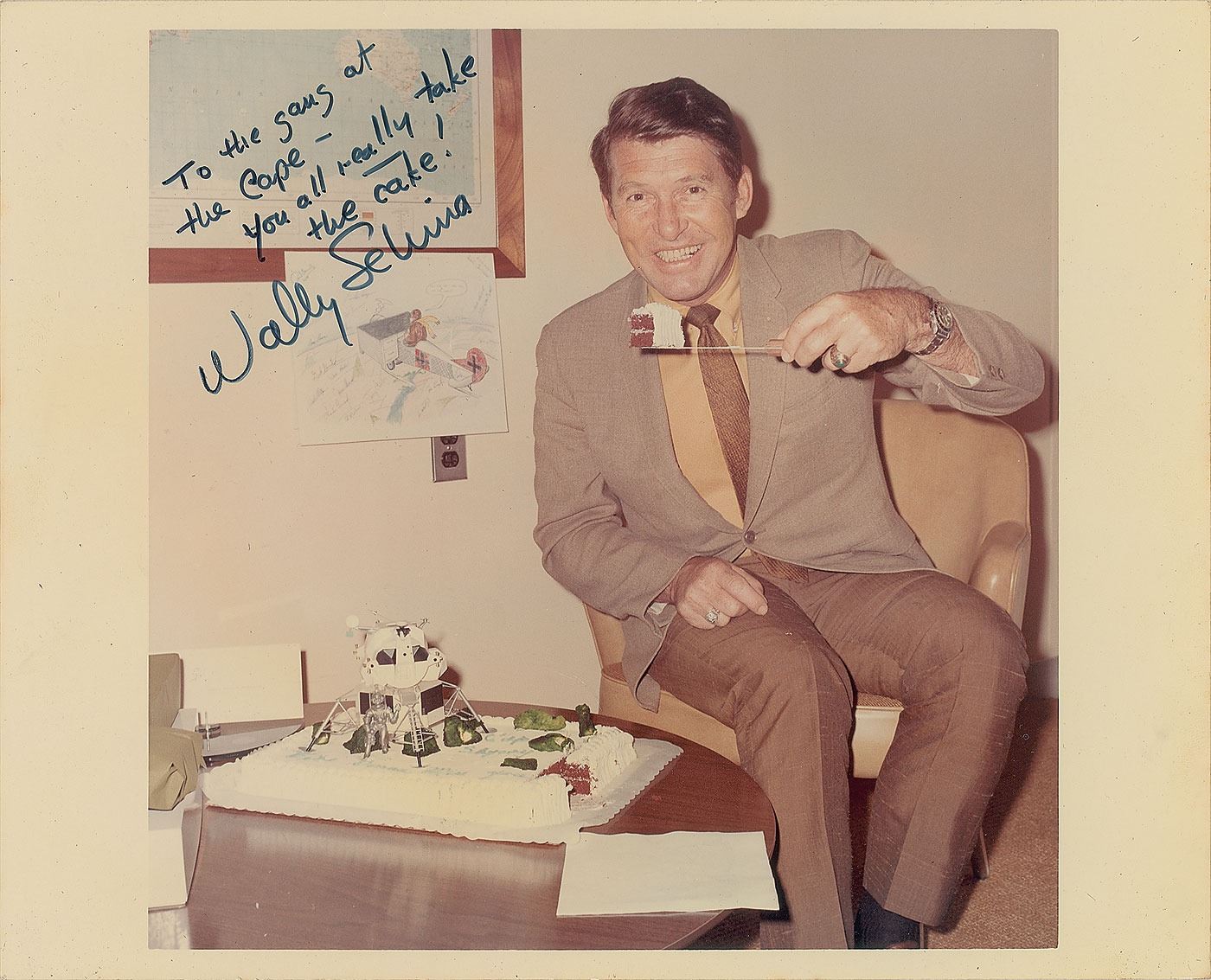 Unique color glossy 10 x 8 photo of Schirra eating a slice of cake, signed and inscribed in black felt tip, “To the gang at the Cape—you all really take the cake! Wally Schirra.” Reverse bears “A Kodak Paper” watermarks. In fine condition.