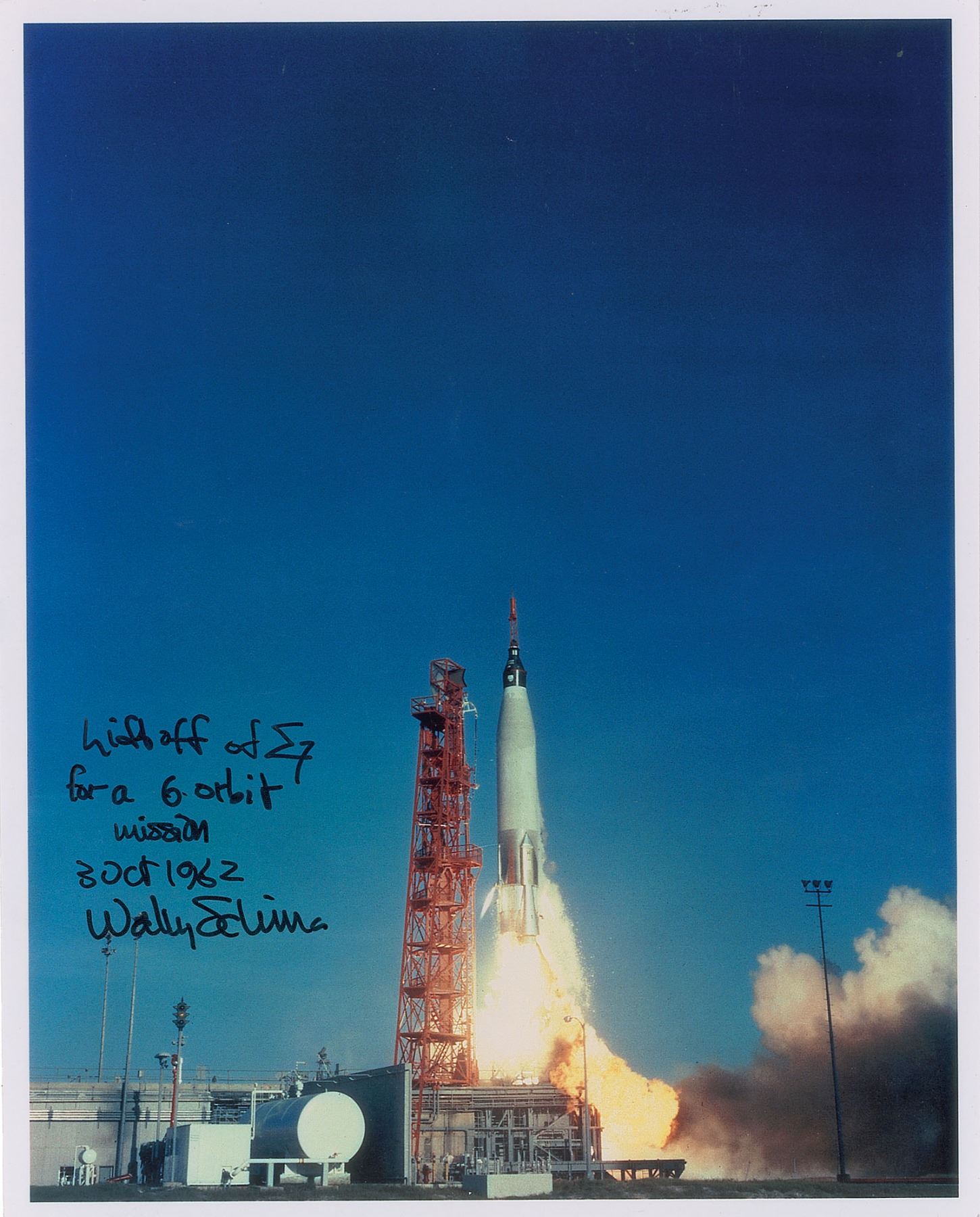 Color satin-finish 8 x 10 photo of the Mercury-Atlas 8 launch, signed in black felt tip, "Liftoff of Sigma 7 for a 6 orbit mission, 3 Oct 1962, Wally Schirra." In fine condition.