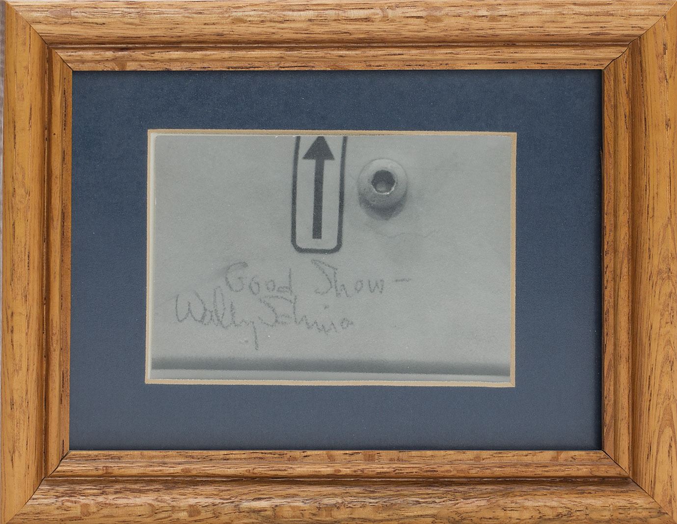 One-of-a-kind vintage glossy 4 x 3 close-up photo of an upward-facing arrow decal on an Apollo 7 command module panel, signed in black felt tip, "Good show—Wally Schirra." Matted and framed to an overall size of 8.25 x 6.25. In fine condition. From the personal collection of a former Apollo program engineer, who notes: 'Schirra was a practical joker. So we put an up arrow decal on one of the CM panels. There is no up or down in zero gravity. Wally saw it and duly acknowledged it with this photo. I don't think another one exists.'