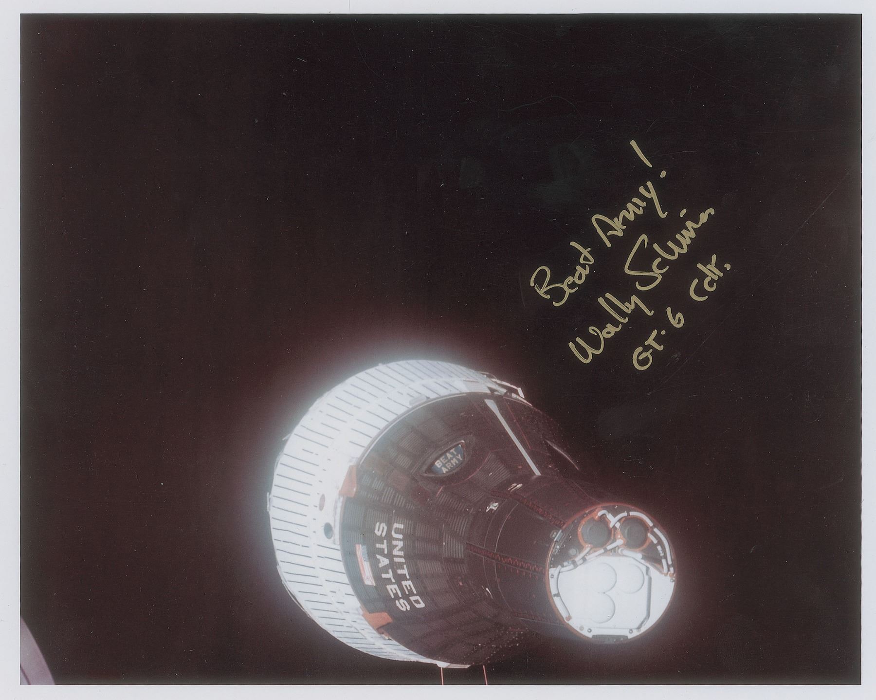 Color satin-finish 8 x 10 photo of the Gemini 6A spacecraft as viewed from the nearby Gemini 7, with Schirra's 'Beat Army' sign visible in the window, signed in gold ink, "Beat Army! Wally Schirra, GT-6 Cdr." In very fine condition. During the mission's historic space rendezvous, Schirra playfully held up the 'Beat Army' sign for Gemini 7 Command Pilot Frank Borman, the lone Army man between the two crews.