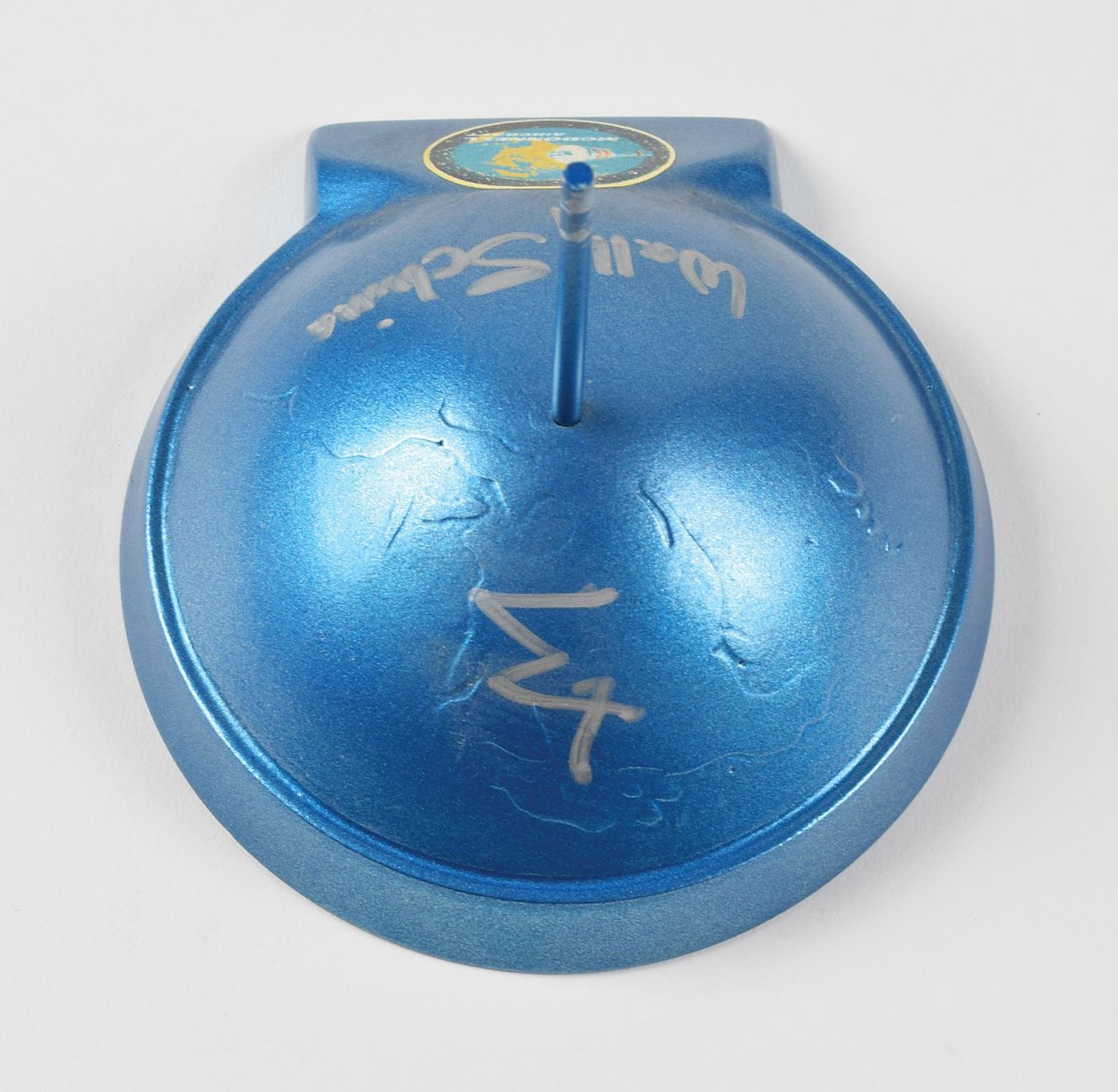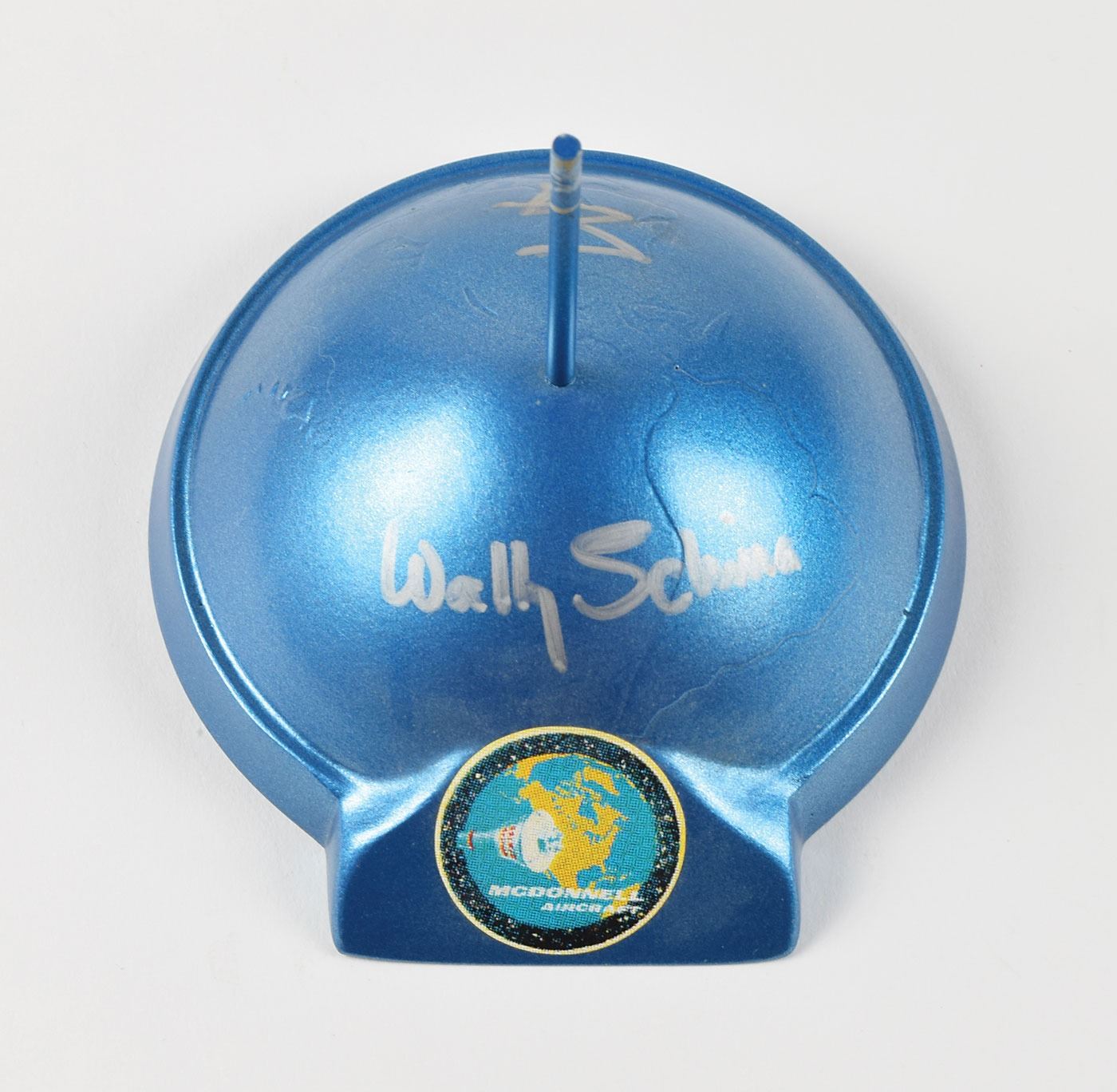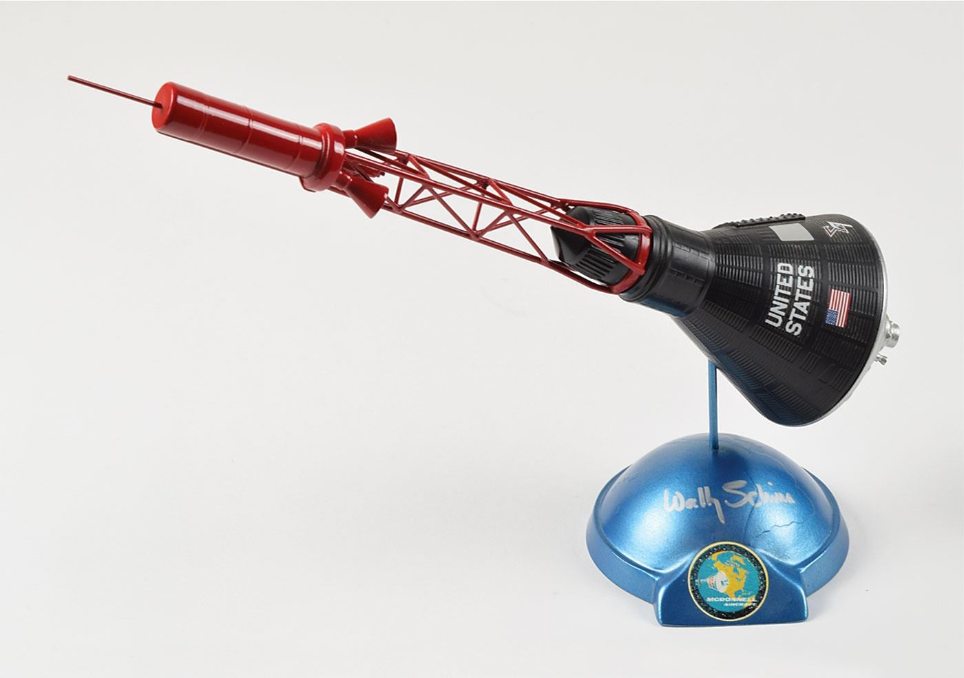 Phenomenal vintage contractor's model of Wally Schirra's Sigma 7 spacecraft. The model approximately measures 9.5? tall and 11.5? in length, and consists of the capsule with "United States" stenciling and Sigma 7 insignia, the escape tower, and a rounded blue base with McDonnell Aircraft sticker, signed on the base in silver ink by Schirra, who adds the Sigma 7 logo on the opposite side. In fine condition.