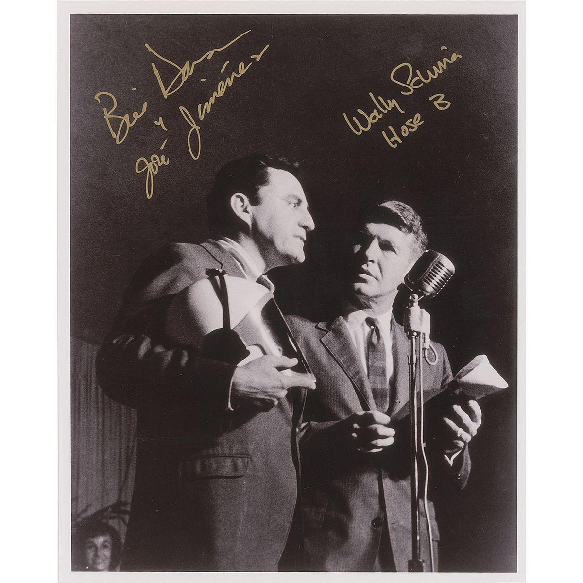 Satin-finish 8 x 10 photo of the two on stage, signed in gold ink, “Bill Dana, Jose Jimenez,” and “Wally Schirra Jose B.” In very fine condition.