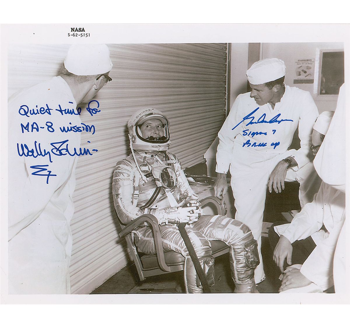 Satin-finish 10 x 8 photo of Schirra relaxing with Gordon Cooper before his mission, signed in blue felt tip, “Quiet time for MA-8 mission, Wally Schirra,” and “Gordon Cooper, Sigma 7 back up.” In very fine condition.