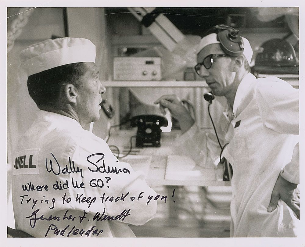 Glossy 10 x 8 NASA photo of Schirra and Wendt engaged in a discussion before Schirra’s Mercury flight, signed in black felt tip, “Wally Schirra, Where did he go?,” and “Trying to keep track of you! Guenter F. Wendt, Padleader.” In fine condition, with a crease to top left corner.