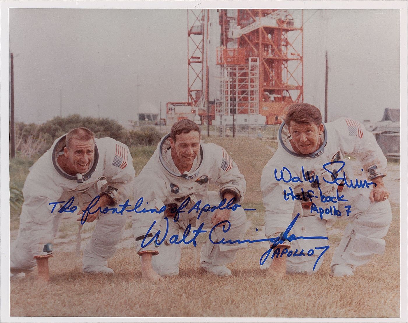 Playful color satin-finish 10 x 8 photo of the Apollo 7 crew posing like football linemen, fittingly signed in blue felt tip, "The frontline of Apollo—Walt Cunningham, Apollo 7" and "Wally Schirra, Half-back, Apollo 7." In fine condition.