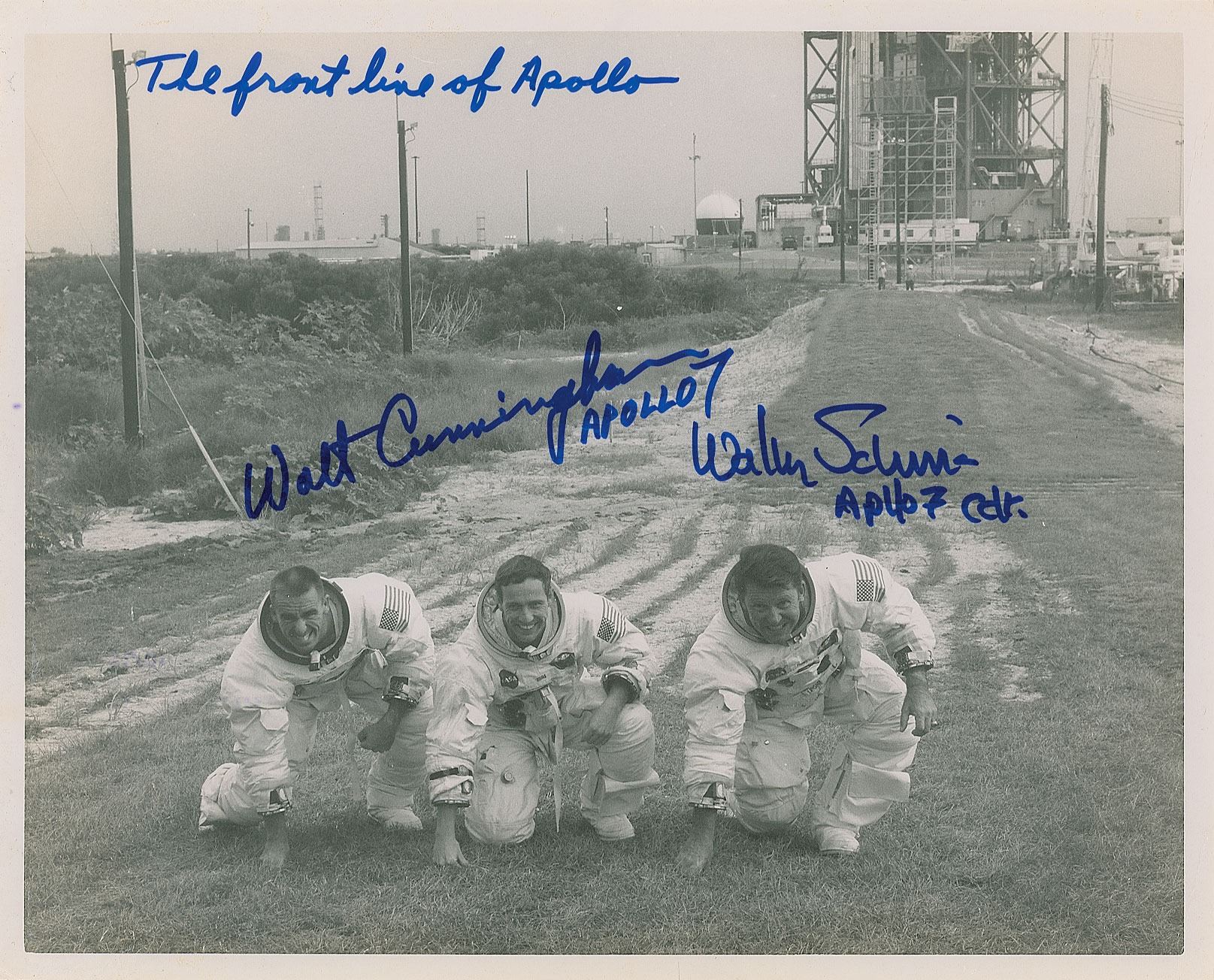 Scarce glossy 10 x 8 US Air Force photo of the crew of Apollo 7 wearing their space suits and posing in football-inspired three-point stances, signed in blue felt tip, "The front line of Apollo, Walt Cunningham, Apollo 7" and "Wally Schirra, Apollo 7 Cdr." Reverse bears a "U.S. Air Force Photo" stamp. In fine condition, with a few small surface creases.