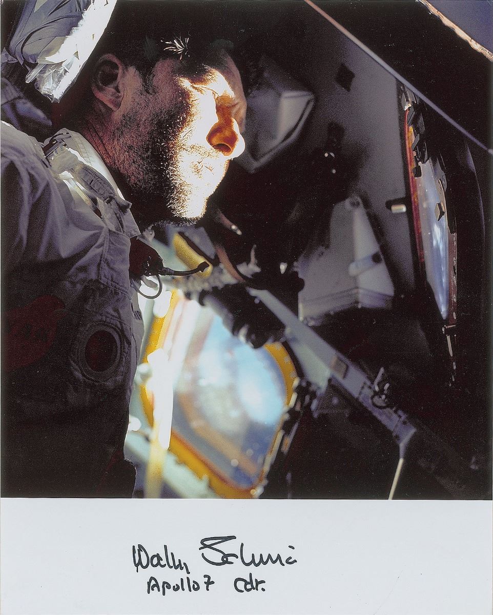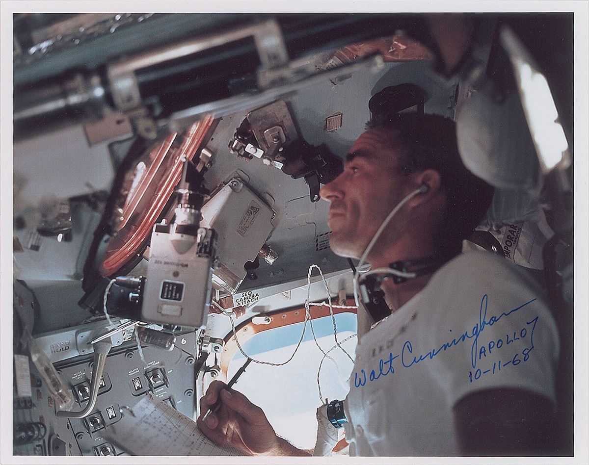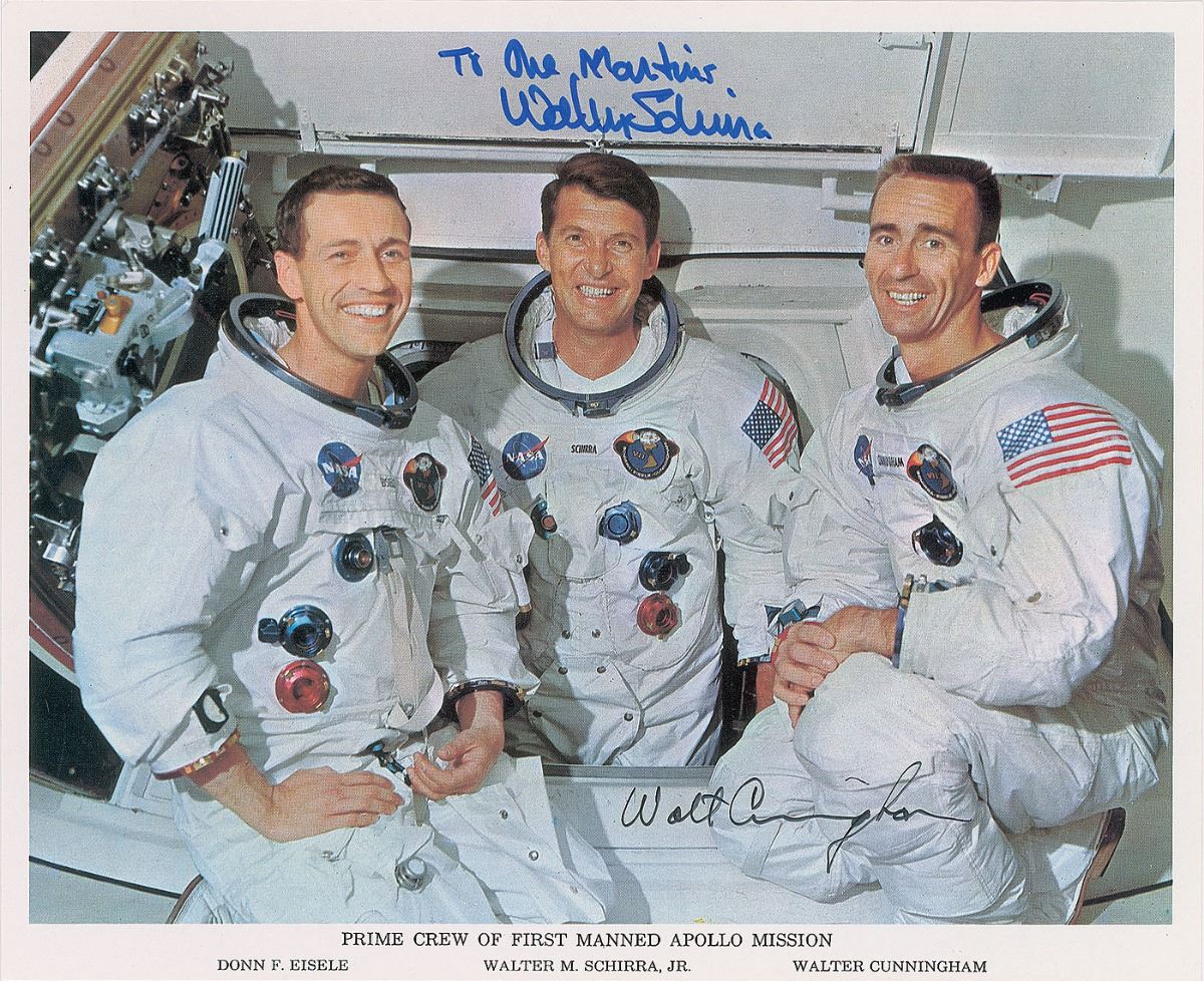 Three photos: a color satin-finish 8 x 10 photo of Schirra staring out a window of the Apollo 7 module, signed in the lower border in black felt tip, “Wally Schirra, Apollo 7 Cdr.”; a color satin-finish 10 x 8 photo of Cunningham taking notes while orbiting inside the Apollo 7 craft, signed in blue felt tip, “Walt Cunningham, Apollo 7, 10–11–68”; and an official color 10 x 8 NASA lithograph of the Apollo 7 crew posing in their white space suits, signed and inscribed in blue felt tip, “To the Martins, Wally Schirra,” and in black felt tip, “Walt Cunningham.” In overall fine condition.