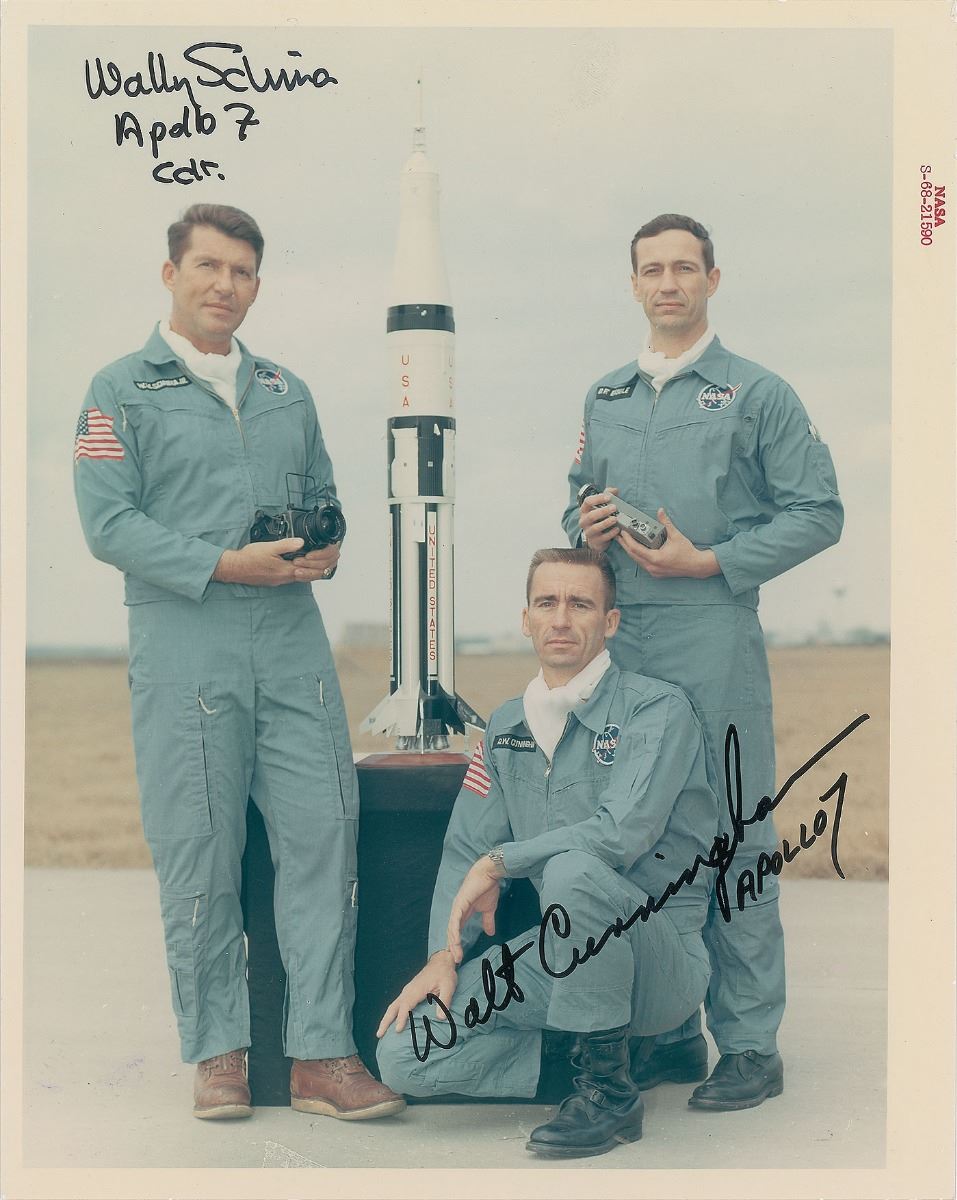 Official color glossy 8 x 10 red-numbered NASA photo of the Apollo 7 prime crew, signed in black felt tip, “Wally Schirra, Apollo 7 Cdr.,” and “Walt Cunningham, Apollo 7.” Reverse bears “A Kodak Paper” watermarks. In fine condition.