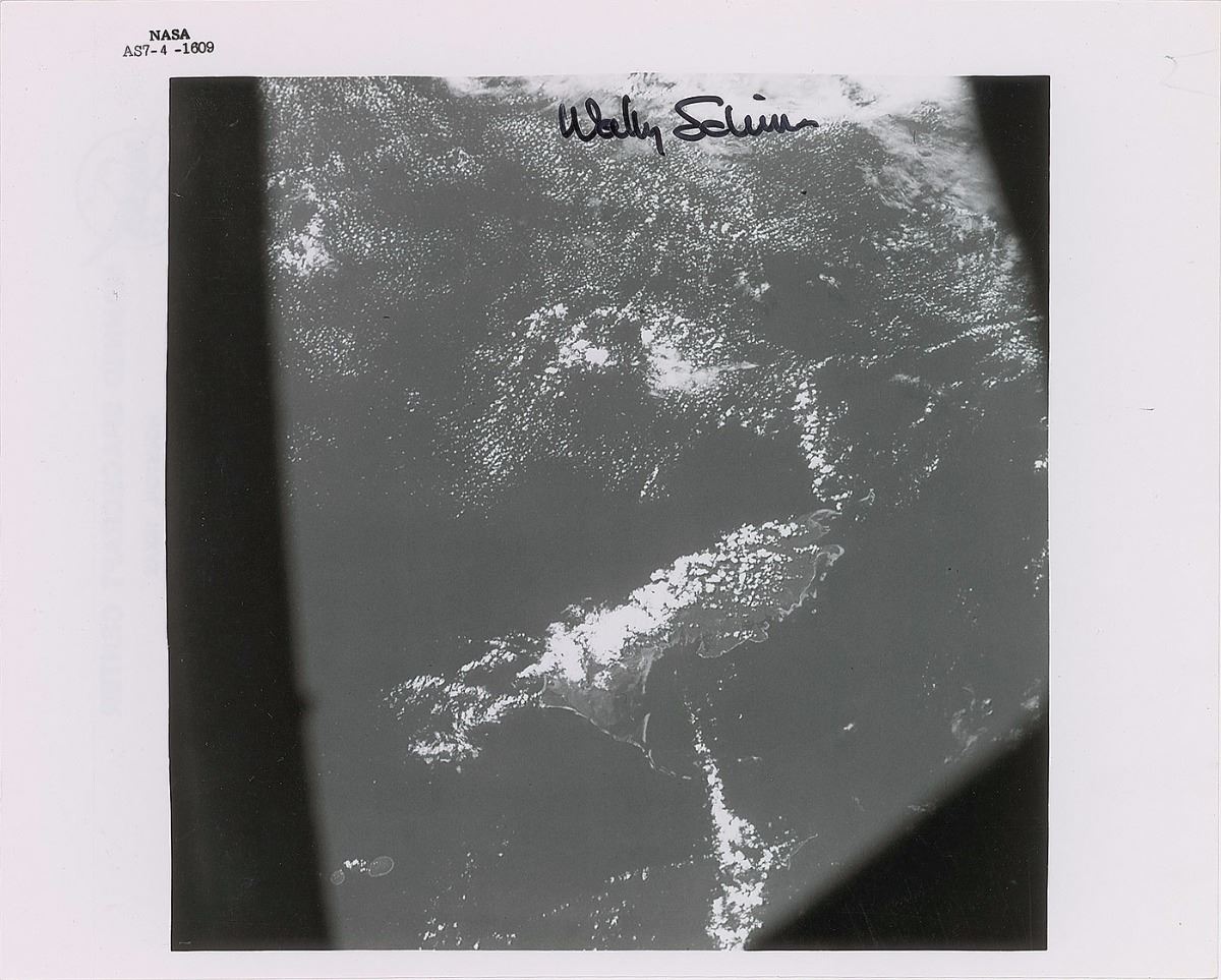 Two photos: an official color semi-glossy 10 x 8 red-numbered NASA photo of Hurricane Gladys from the viewpoint of the Apollo 7 spacecraft, signed in black felt tip, “Walt Cunningham, Apollo 7”; and an official glossy 10 x 8 NASA photo of Woodlark Island in the Solomon Sea from the viewpoint of the Apollo 7 spacecraft, signed in black felt tip, “Wally Schirra.” In overall fine condition.
