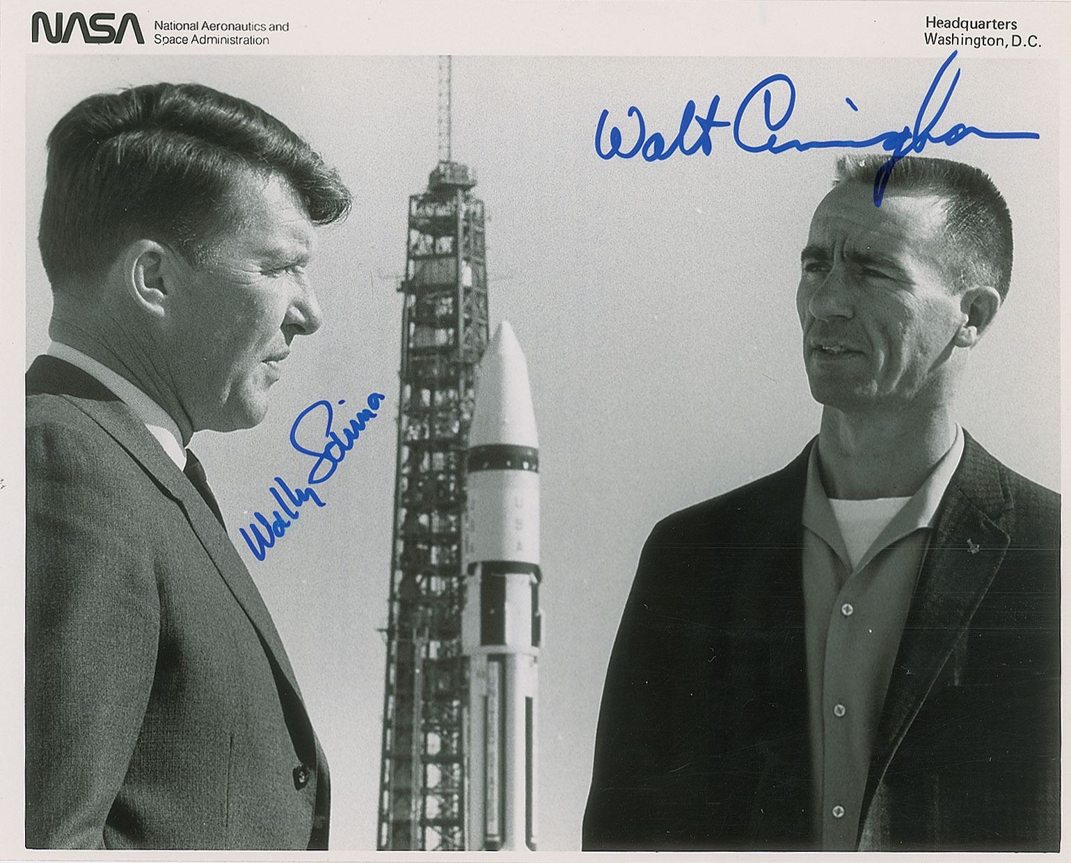 Official glossy 10 x 8 NASA photo of the commander and lunar module pilot for the Apollo 7 mission, signed in blue felt tip by Wally Schirra and Walt Cunningham. Reverse bears faded NASA caption text. In fine condition.