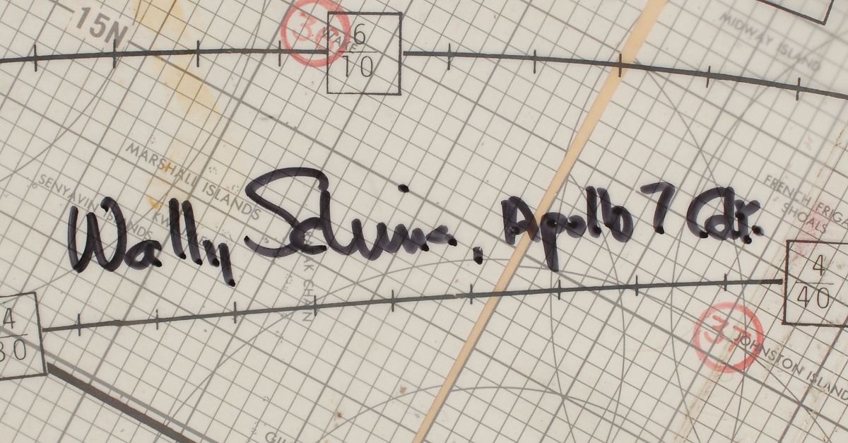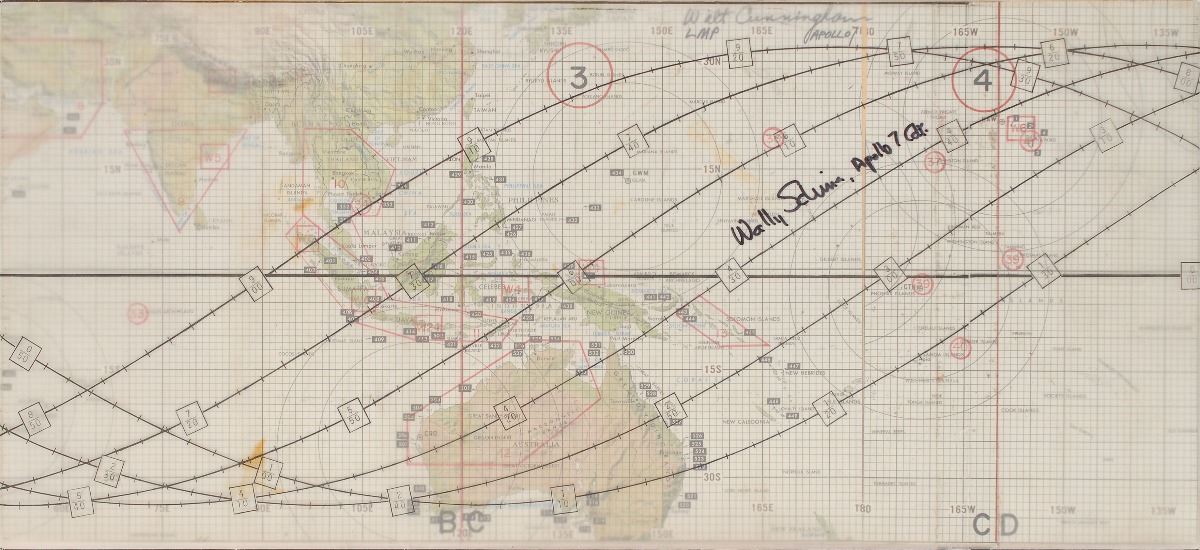 Unusual training-used double-sided map of Earth with a translucent orbital overlay, 19.75 x 9, signed on the map in black felt tip, “Walt Cunningham, LMP Apollo 7,” and on the overlay, “Wally Schirra, Apollo 7 Cdr.” In fine condition. Accompanied by a certificate of authenticity from the widow of Donn Eisele certifying that this map was used during Apollo 7 planning, as well as subsequent photos of Schirra and Cunningham with the map at the time of signing. An appealing oversized piece highlighted by excellent provenance.