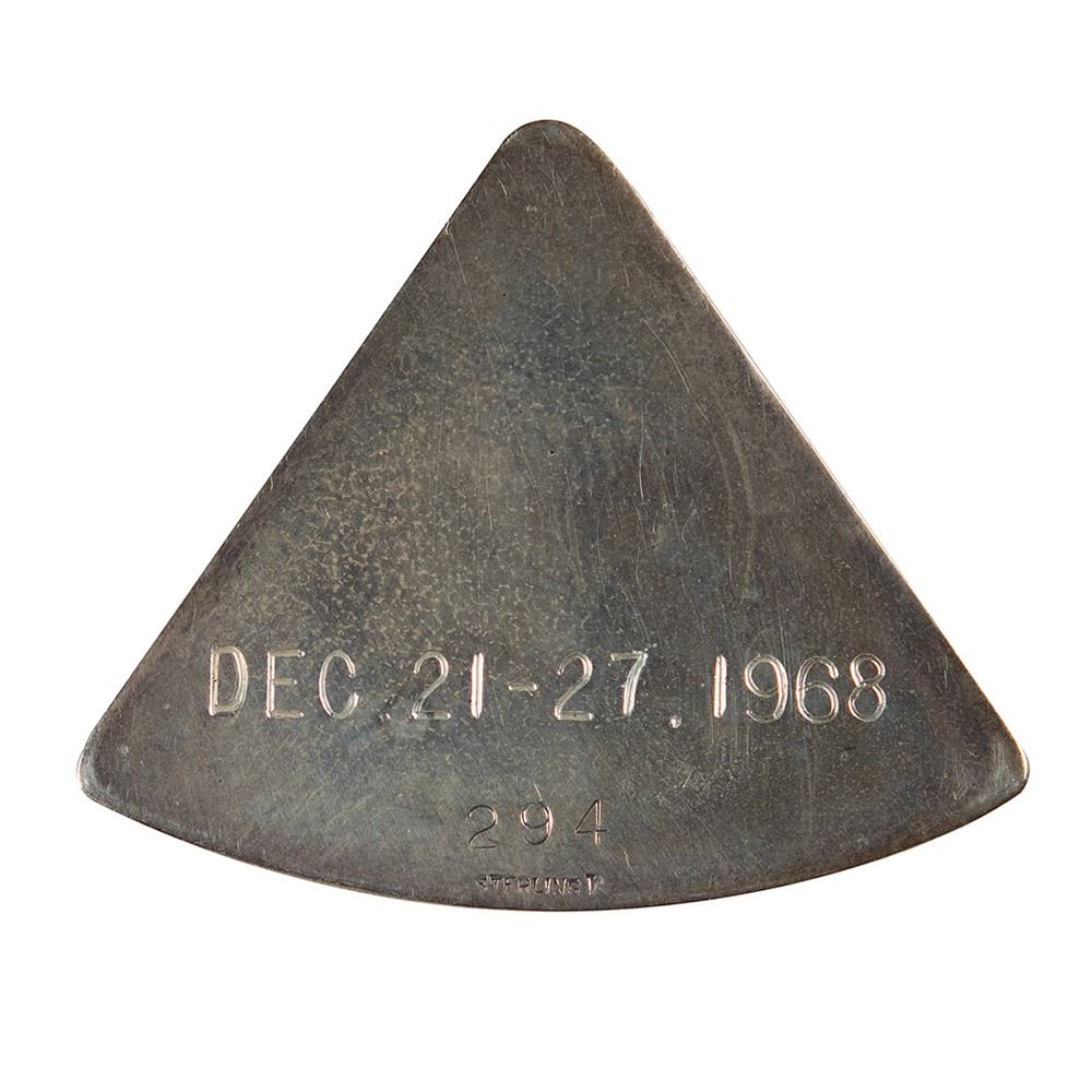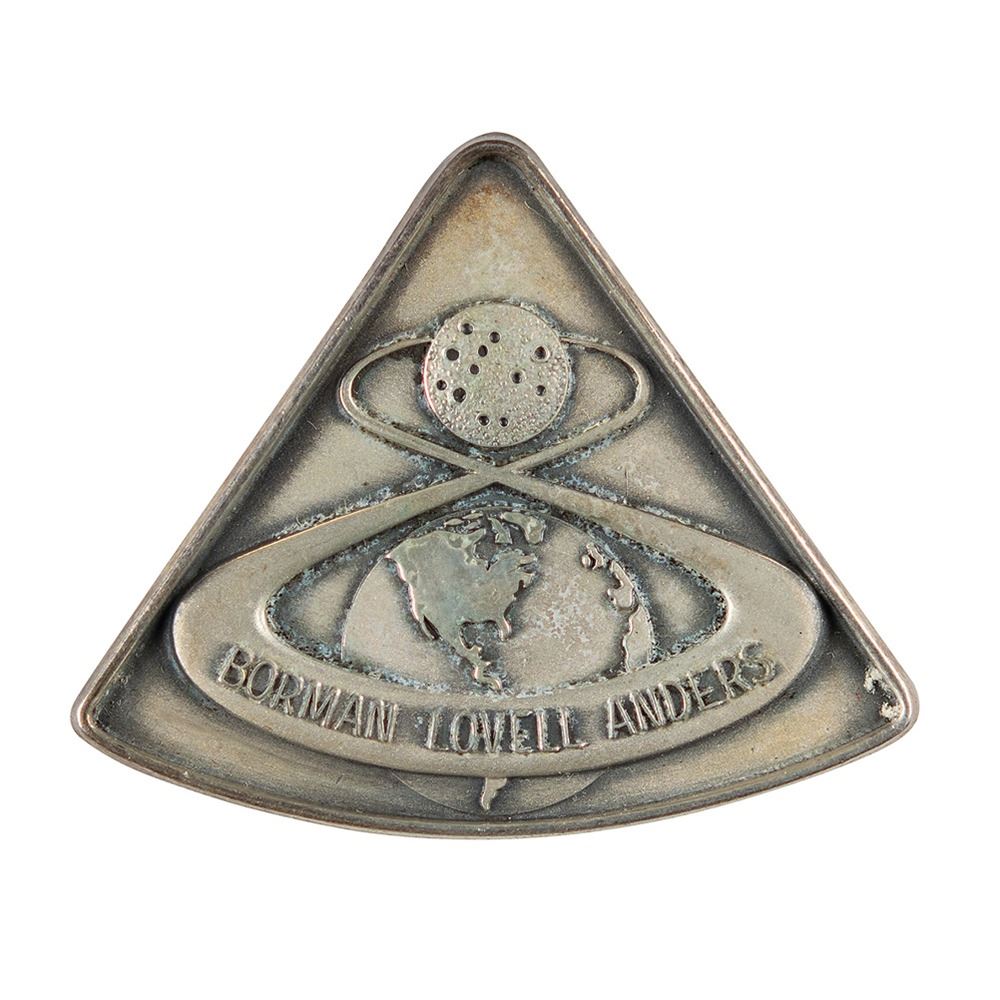 Wally Schirra's flown sterling silver Apollo 8 Robbins medallion, measuring approximately 1.5è x 1.25è, featuring a raised design of the mission insignia on the face‰ÛÓan "8" looping around the Earth and Moon, reflecting both the mission number and the circumlunar nature of the mission. The reverse is engraved with the mission dates, "Dec. 21‰ÛÒ27, 1968," and serial number, "294." Stamped below with the Robbins "Sterling" hallmark. Condition is mint state. Accompanied by the original case, which has a cracked lid. Includes a photocopy of a letter of provenance by Schirra, establishing "Apollo 8 #294" as part of his personal collection, noting: "The commander for each flight after Apollo 7 gave me a flown medallion in order that I might have a complete set." A magnificent flown keepsake from the historic Apollo 8 mission, representing mankind's first journey to the 'dark side of the moon.'