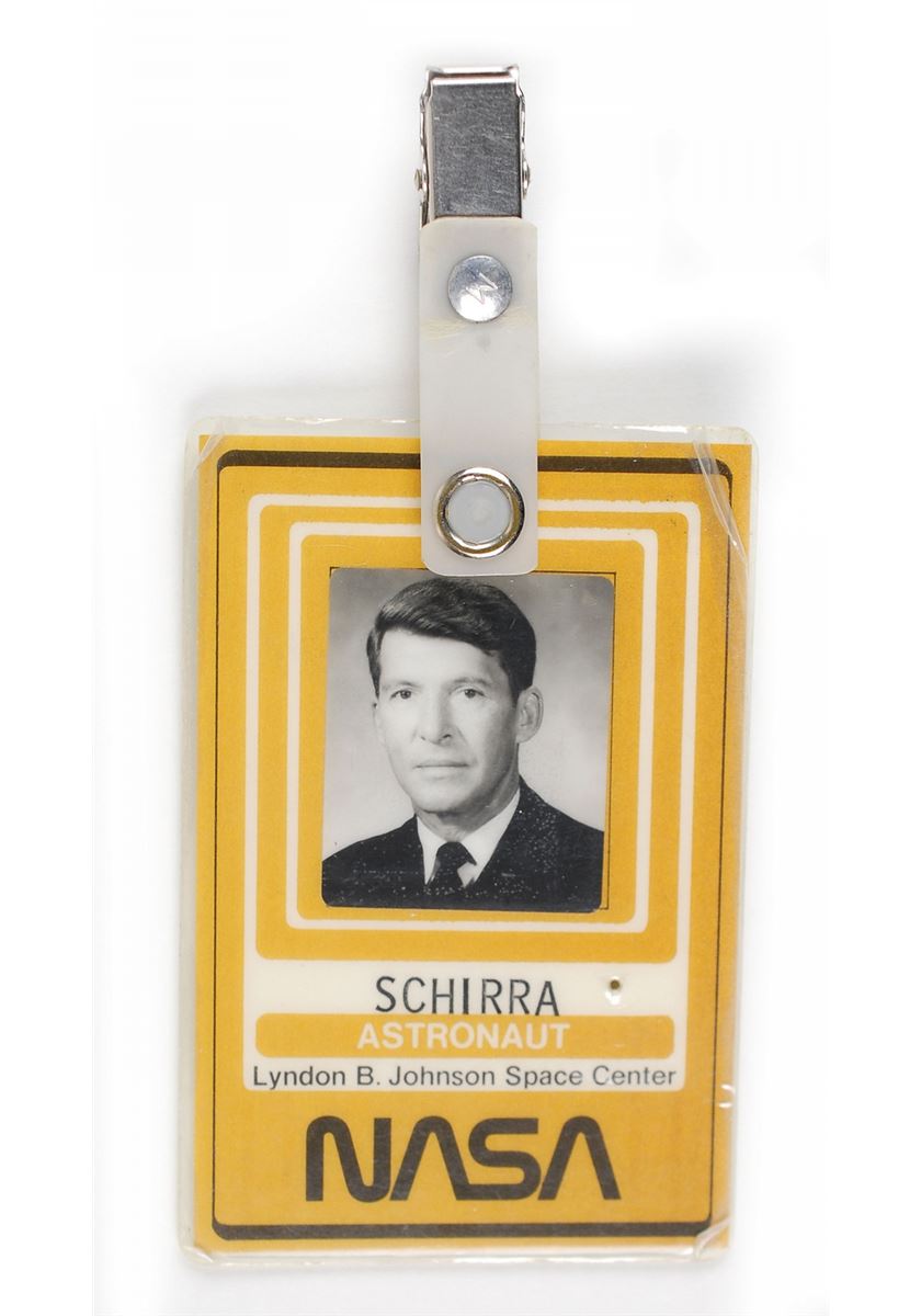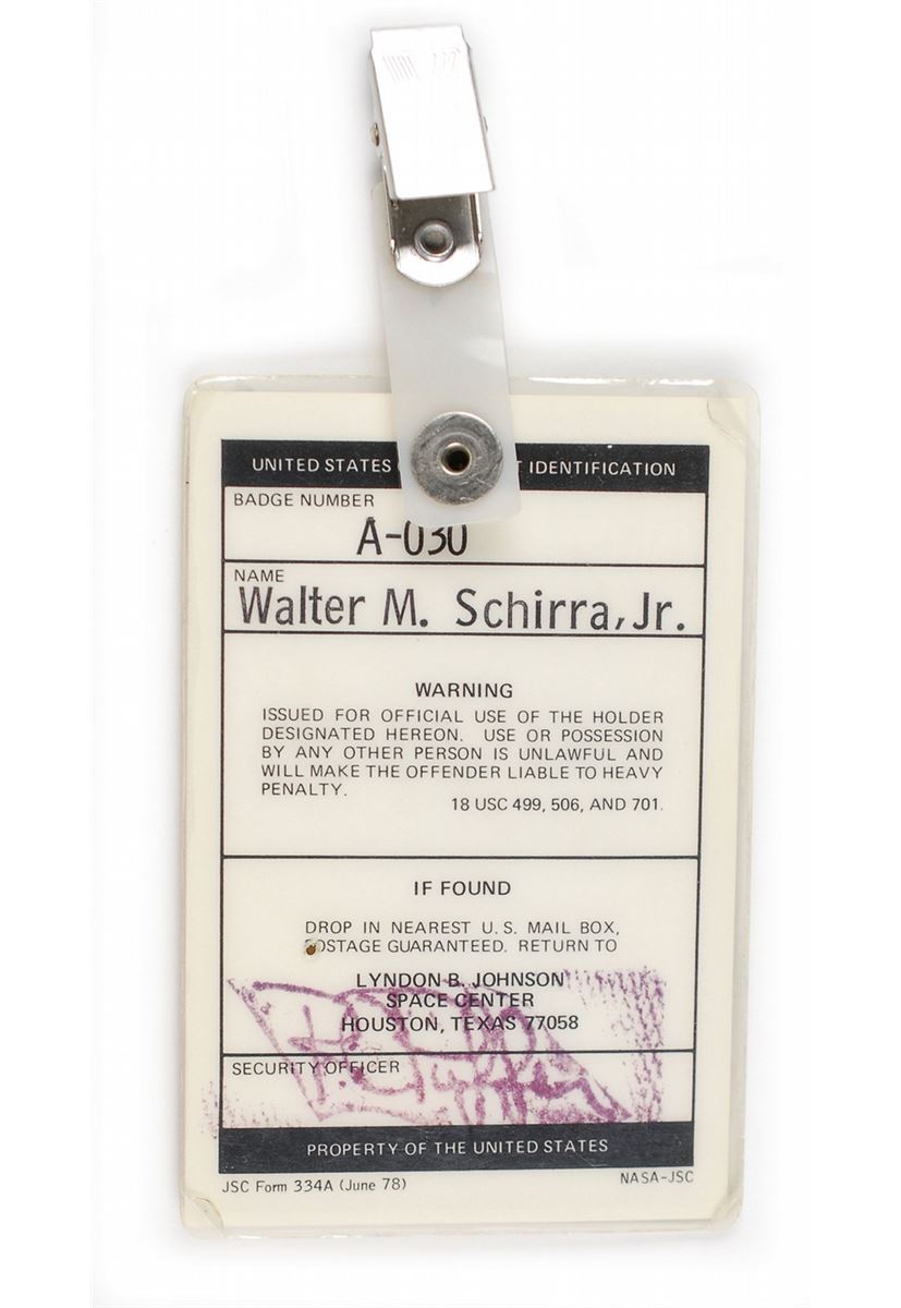 Schirra’s laminated NASA identification badge for the Lyndon B. Johnson Space Center in Houston, Texas, 2.5 x 3.75, circa 1978, featuring an image of him with text below reading, “Schirra, Astronaut.” Two areas on the reverse are filled out in type with his badge number, “A-030,” and name, “Walter J. Schirra, Jr.” Reverse is also stamped with the signature of a security officer at the bottom. In the lower margin the badge is identified as: “JSC Form 334A (June 78).” In fine condition, with expected wear from use. The Leon Ford Collection.