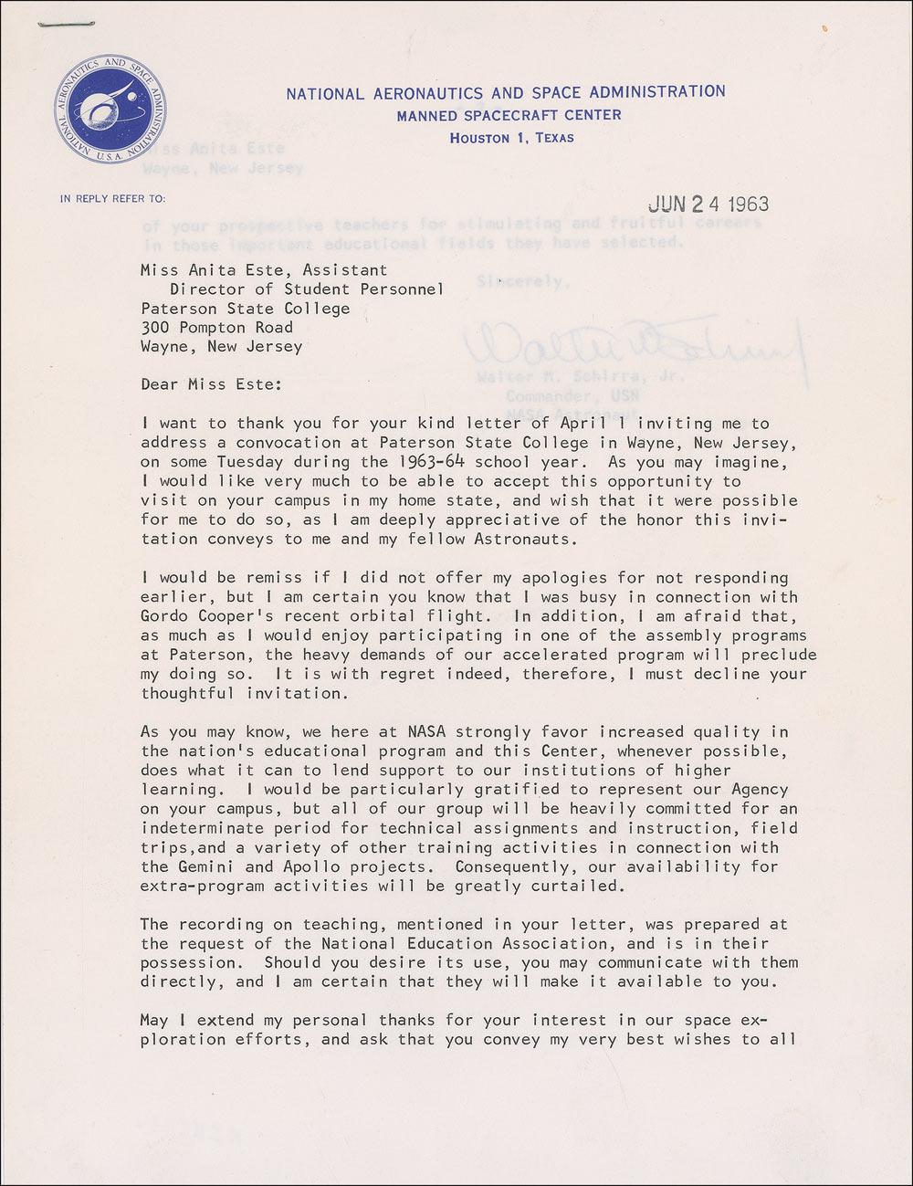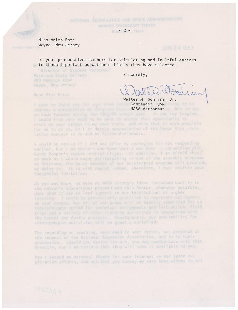 Early TLS signed “Walter M. Schirra,” two pages, 8 x 10.5, NASA letterhead, stamp-dated June 24, 1963. Letter to the director of student personnel at Paterson State College declining an invitation to speak. In part: “I would be remiss if I did not offer my apologies for not responding earlier, but I am certain you know that I was busy in connection with Gordo Cooper’s recent orbital flight. In addition…the heavy demands of our accelerated program will preclude my doing so…As you know, we here at NASA strongly favor increased quality in the nation’s educational program and this Center, whenever possible, does what it can to lend support to our institutions of higher learning. I would be particularly gratified to represent our Agency on your campus, but all of our group will be heavily committed for an indeterminate period for technical assignments and instruction, field trips, and a variety of other training activities in connection with the Gemini and Apollo projects. Consequently, our availability for extra-program activities will be greatly curtailed.” In fine condition, with pages stapled together at top left, and some light creases and wrinkles. An early example with terrific content.