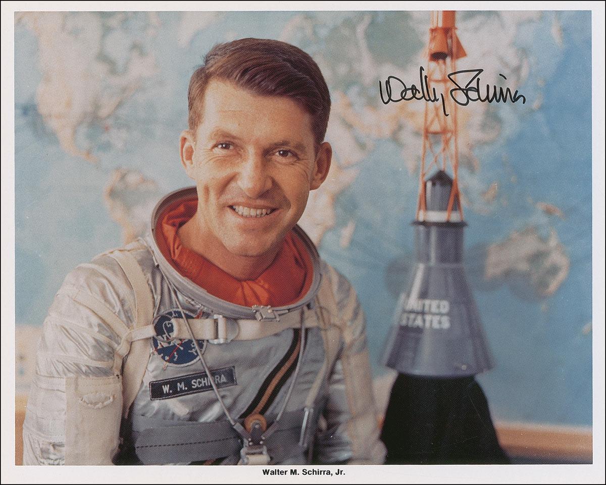 Color 10 x 8 NASA photo of Schirra in his spacesuit next to a model of the Mercury capsule, signed in black felt tip, “Wally Schirra.” In fine condition.