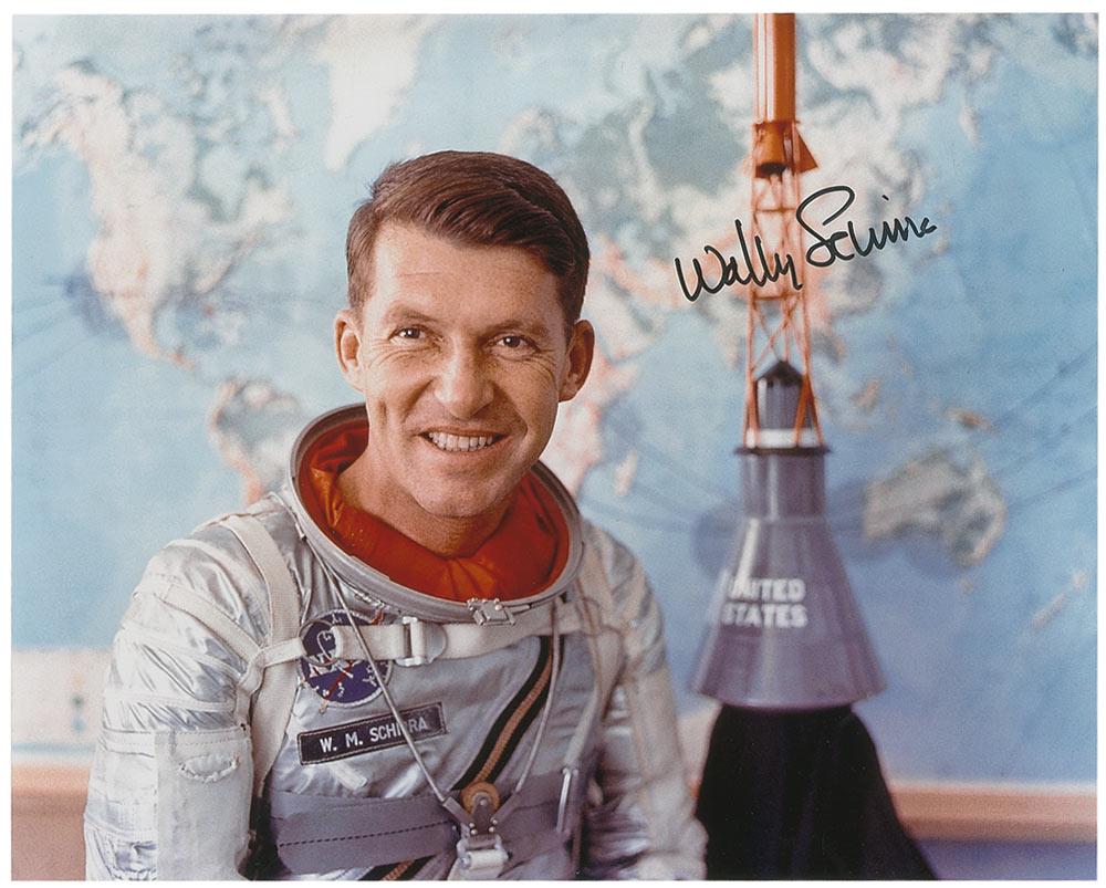 Color satin-finish 10 x 8 photo of Schirra in his spacesuit next to a model of the Mercury capsule, signed in black felt tip, “Wally Schirra.” In very fine condition.