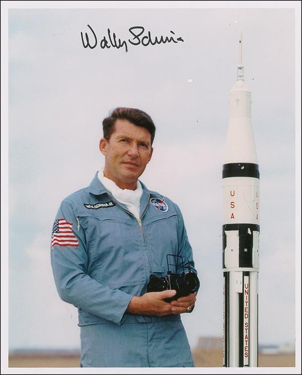 Color satin-finish 8 x 10 photo of Schirra holding a camera and posing next to a model of the Mercury capsule, signed in black felt tip. In fine condition, with a few small spots of discoloration.