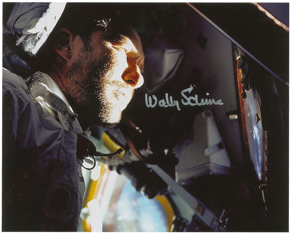 Color satin-finish 10 x 8 photo of a bearded Schirra peering out a small window of the shuttle, signed in silver ink, “Wally Schirra.” In very fine condition.