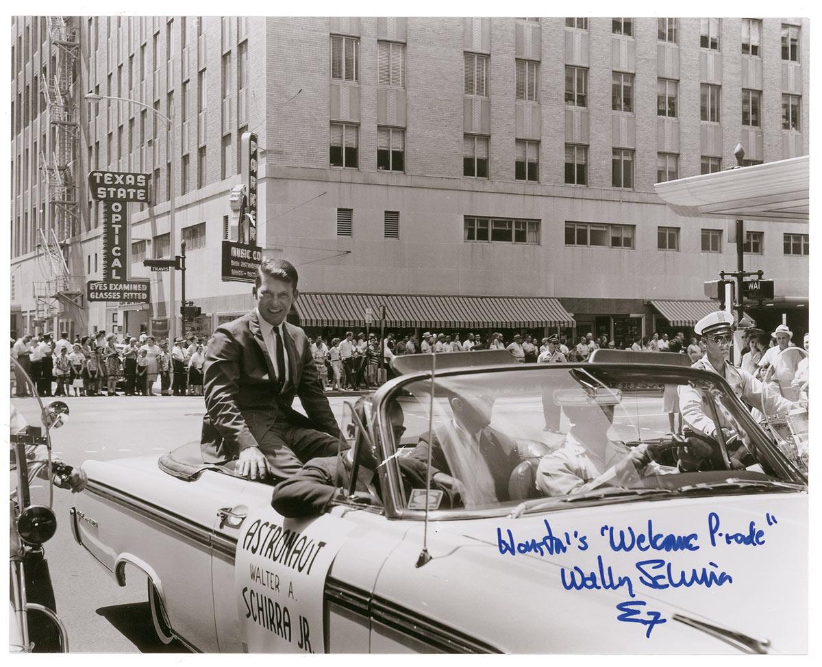 Satin-finish 10 x 8 photo of Schirra riding in a convertible during a ‘Welcome Parade’ in Texas, signed in blue felt tip, “Honsta’s ‘Welcome Parade’, Wally Schirra, E7.” In very fine condition.