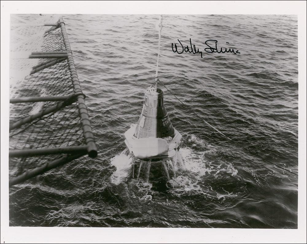 Glossy 10 x 8 photo of the Mercury capsule being retrieved from the sea, signed in black felt tip, “Wally Schirra.” In very fine condition.