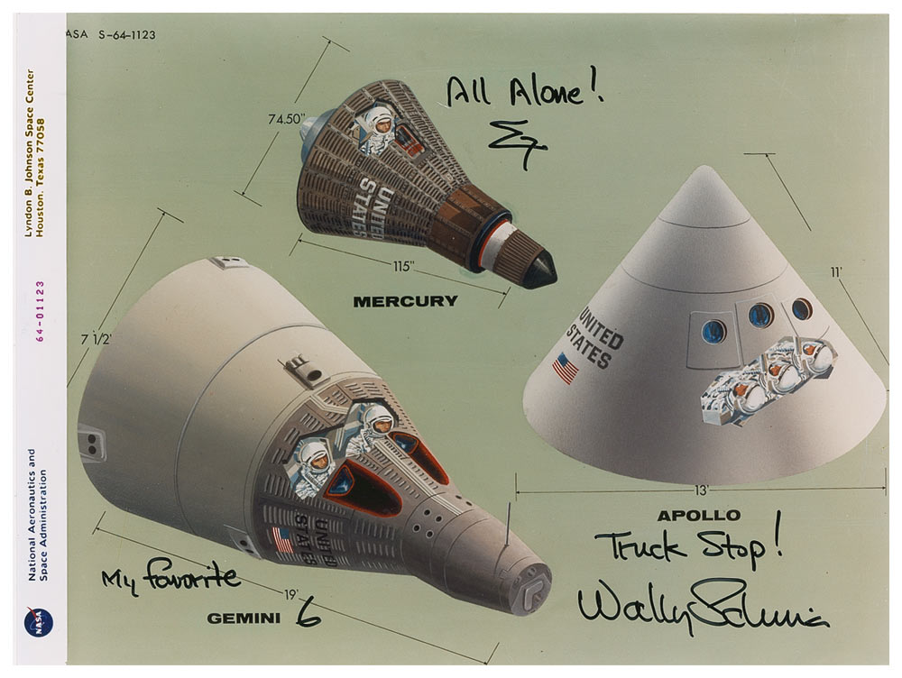 Color satin-finish 10 x 8 ‘red-numbered’ NASA photo of an artist’s rendering of the Mercury, Gemini, and Apollo capsules, signed in black felt tip, with Schirra notating the Mercury capsule “All Alone!,” adding the Sigma 7 symbol, “My favorite,” and “6” under the Gemini capsule, and “Truck stop! Wally Schirra,” under the Apollo capsule. In very fine condition.