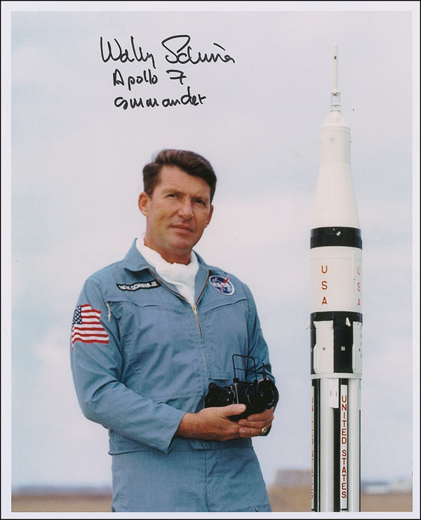 Color satin-finish 8 x 10 photo of Schirra holding a camera and posing next to a Saturn V model rocket, signed in black felt tip, “Wally Schirra, Apollo 7 Commander.” In very fine condition. Schirra never had a white spacesuit portrait done for the Apollo program.