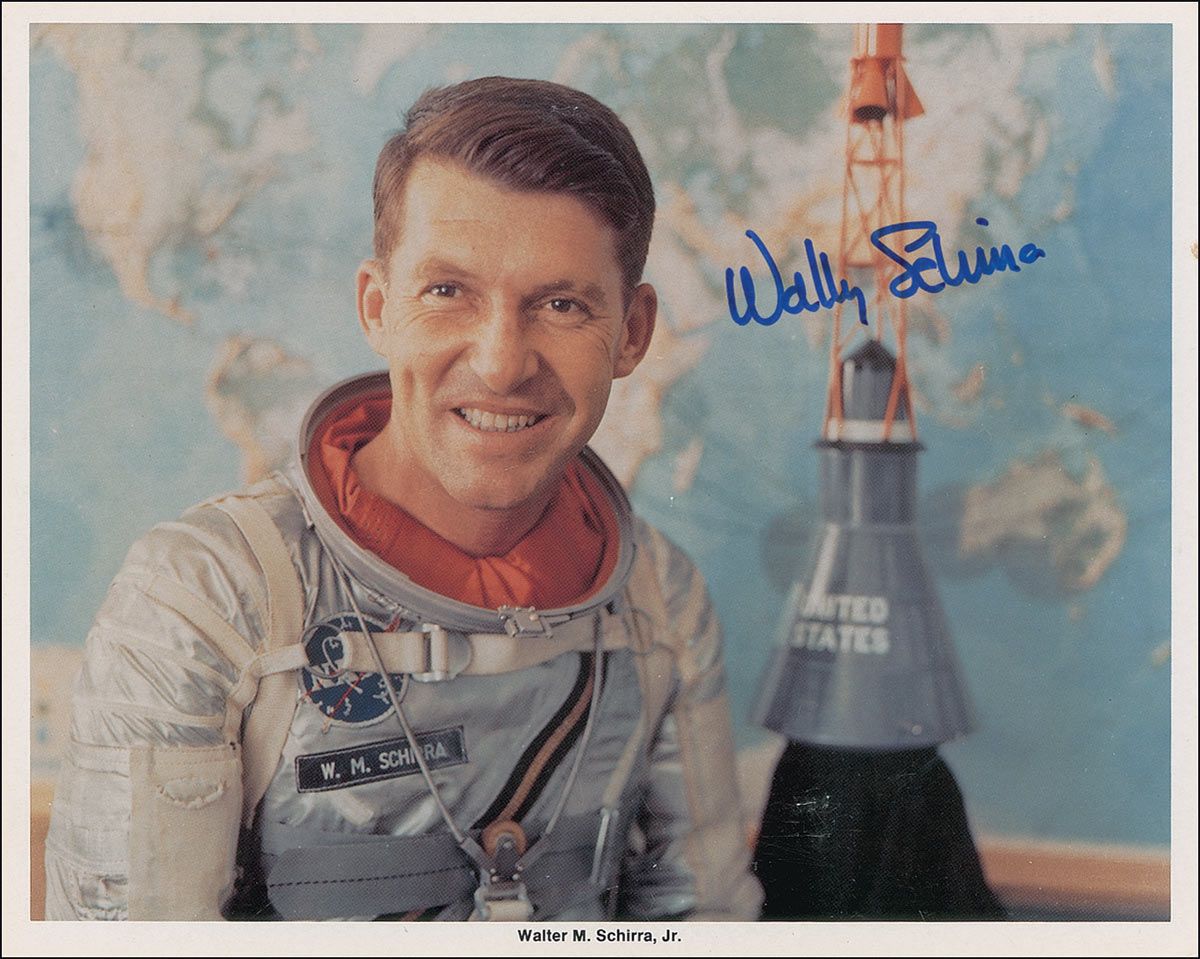 Color 10 x 8 NASA photo of Schirra posing in his spacesuit before a wall-sized world map and a model of the Mercury capsule, signed in blue felt tip. In fine condition, with some light scratches to the finish towards the bottom of the image.