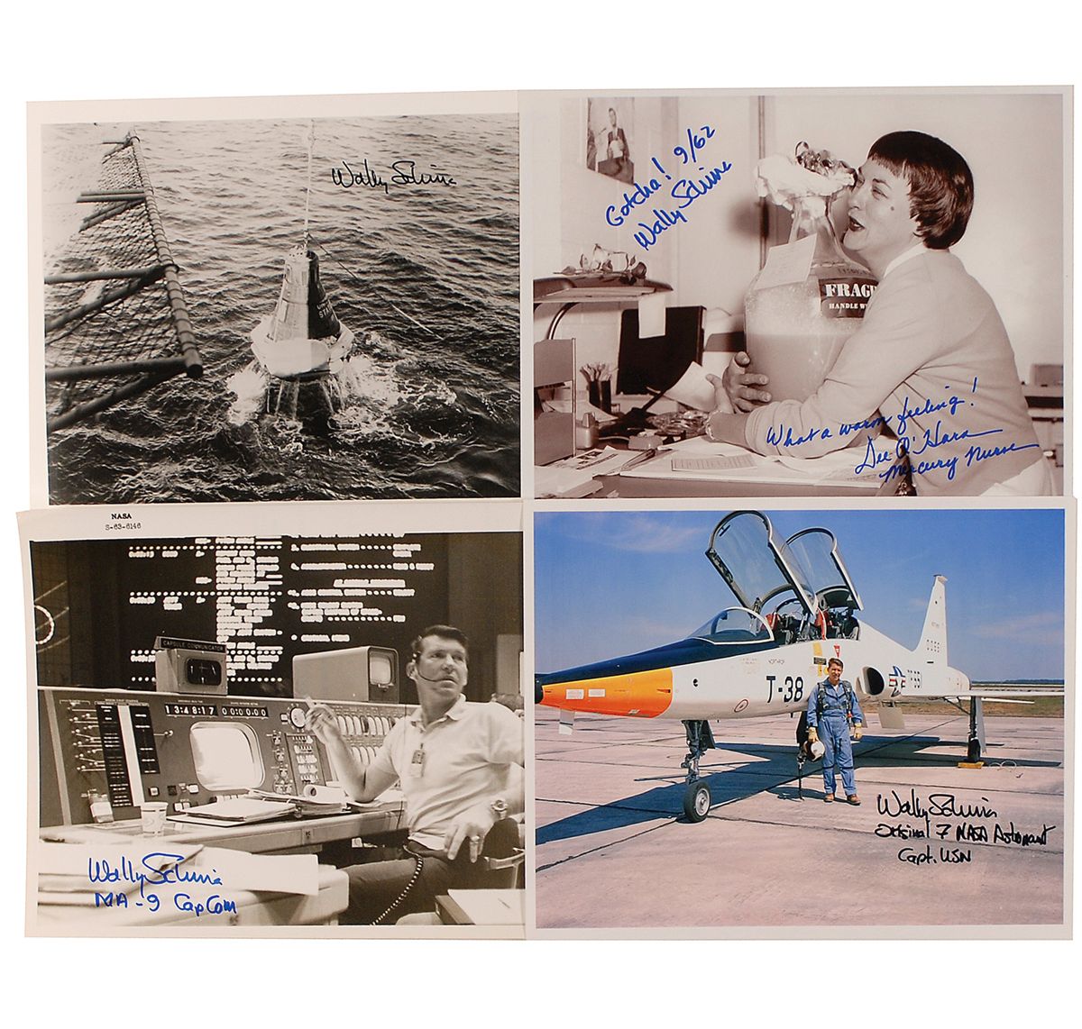 Four signed glossy and satin-finish photos, including one color, each signed in blue or black felt tip by Schirra, with one also signed by Mercury nurse Dee O’Hara. In fine condition. Accompanied by a Sigma 7 recovery cover issued and cancelled to mark the flight of Wally Schirra, signed in blue or black ink by five members of the 6594th Recovery Control Group.