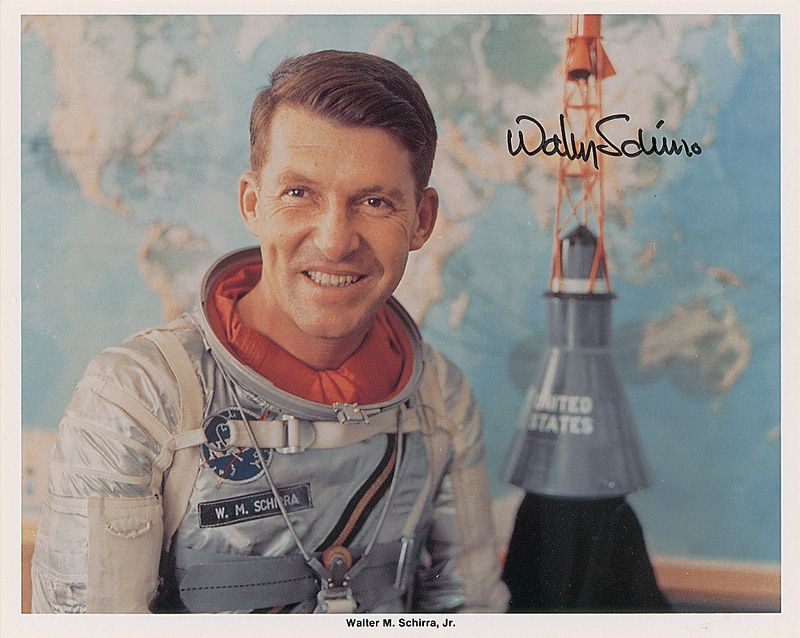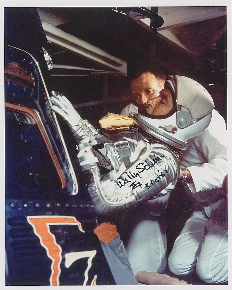 Two color photos: a 10 x 8 NASA photo of Schirra posing in his spacesuit before a wall-sized world map and a model of the Mercury capsule, signed in black felt tip; and a satin-finish 8 x 10 photo of Schirra squeezing into his capsule, also signed in black felt tip. In very fine condition.