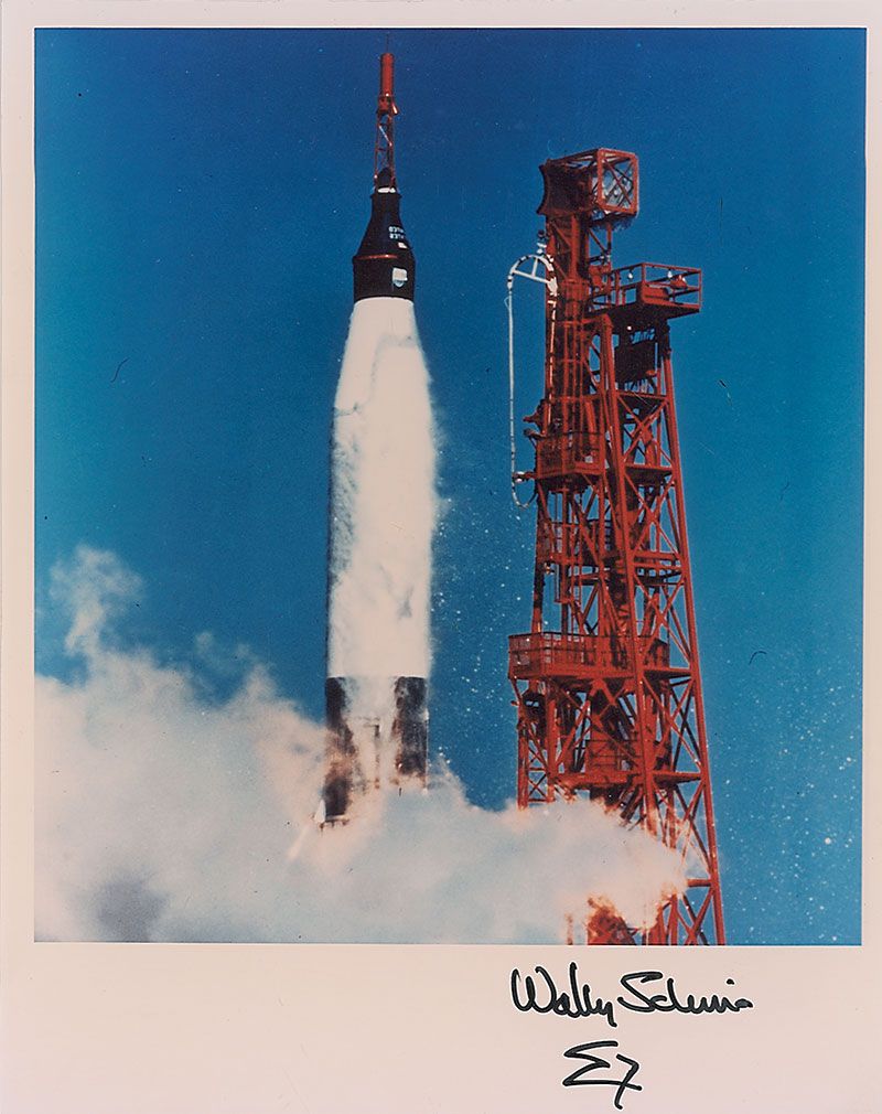 Color satin-finish 8 x 10 photo of a rocket launch, signed in the lower border in black felt tip. In fine condition, with a slightly rough top edge.