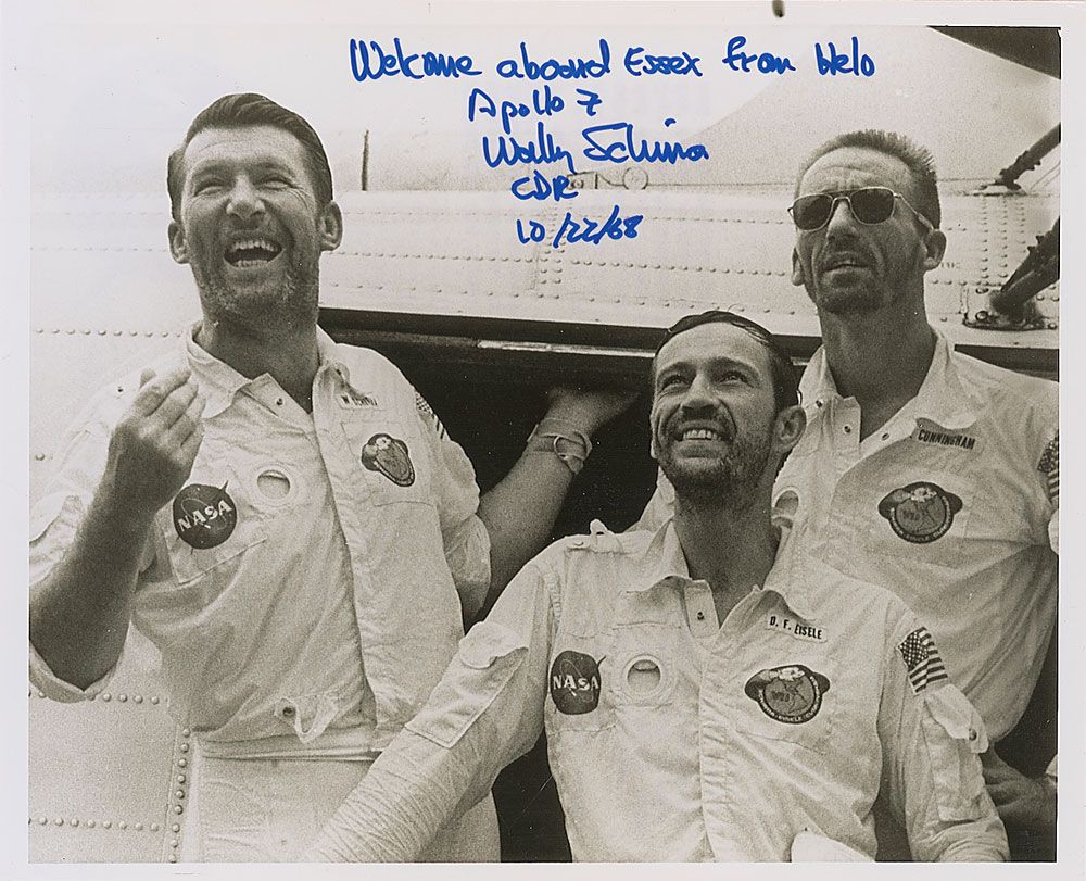 Glossy 10 x 8 NASA photo of Schirra, Eisele, and Cunningham in the doorway of the recovery helicopter, signed in blue felt tip, “Welcome aboard Essex from Helo, Apollo 7, Wally Schirra, CDR, 10/22/68.” In fine condition.