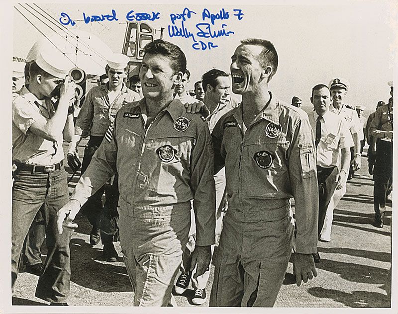 Glossy 10 x 8 NASA photo of Schirra after the Apollo 7 recovery, signed in blue felt tip, “On board Essex post Apollo 7, Wally Schirra, CDR.” Light surface loss to the upper right and silvering to dark areas of the image, otherwise fine condition.