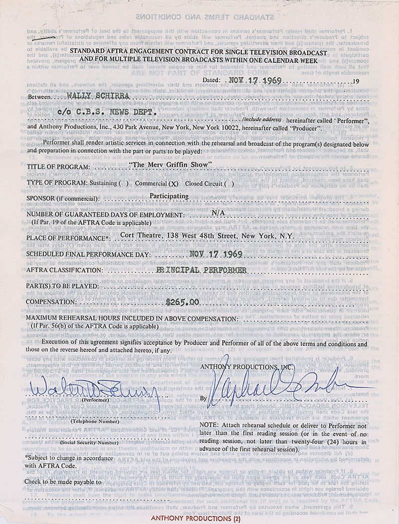 DS, one page, 8.5 x 11, November 17, 1969. Standard AFTRA contract in which Schirra agrees to appear on The Merv Griffin Show on the same day in exchange for $265. Signed at the conclusion in ballpoint by Schirra. A standard AFTRA rider is stapled to the main document in the upper left. In fine condition, with expected document wear.