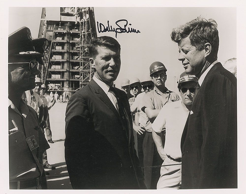 Glossy 10 x 8 photo of Schirra talking with President Kennedy near the launch pad, signed in black felt tip. In very fine condition.