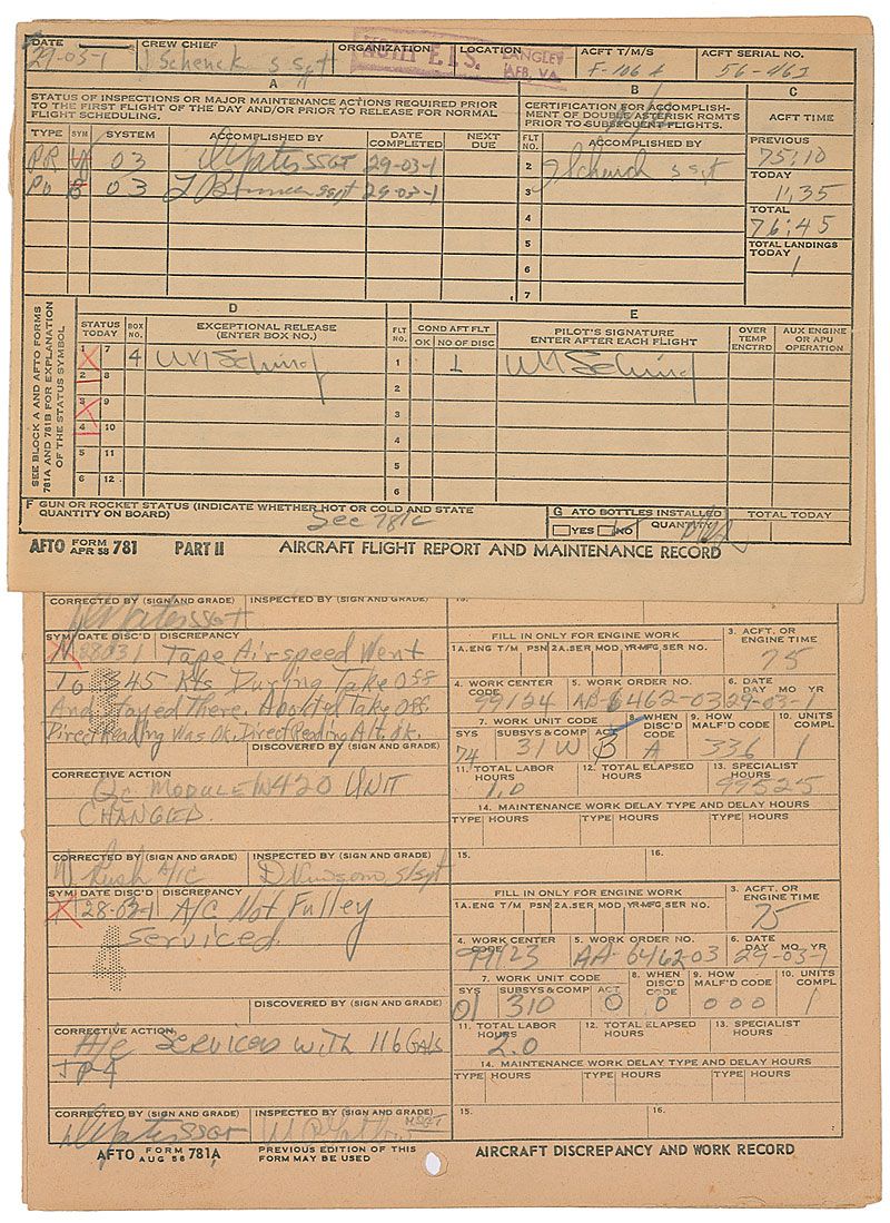 DS, signed in pencil, “W. M. Schirra, Jr,” one page, 8 x 5, March 29, 1961. Maintenance report signed twice by Schirra, once under “Exceptional Release” and once under “Pilot's Signature,” for an F-106A training at Langley AFB in Virginia. Document is stapled to a two-page discrepancy report, listing problems, who discovered them and who corrected and inspected them. Expected wear and a uniform shade of toning, otherwise fine condition.