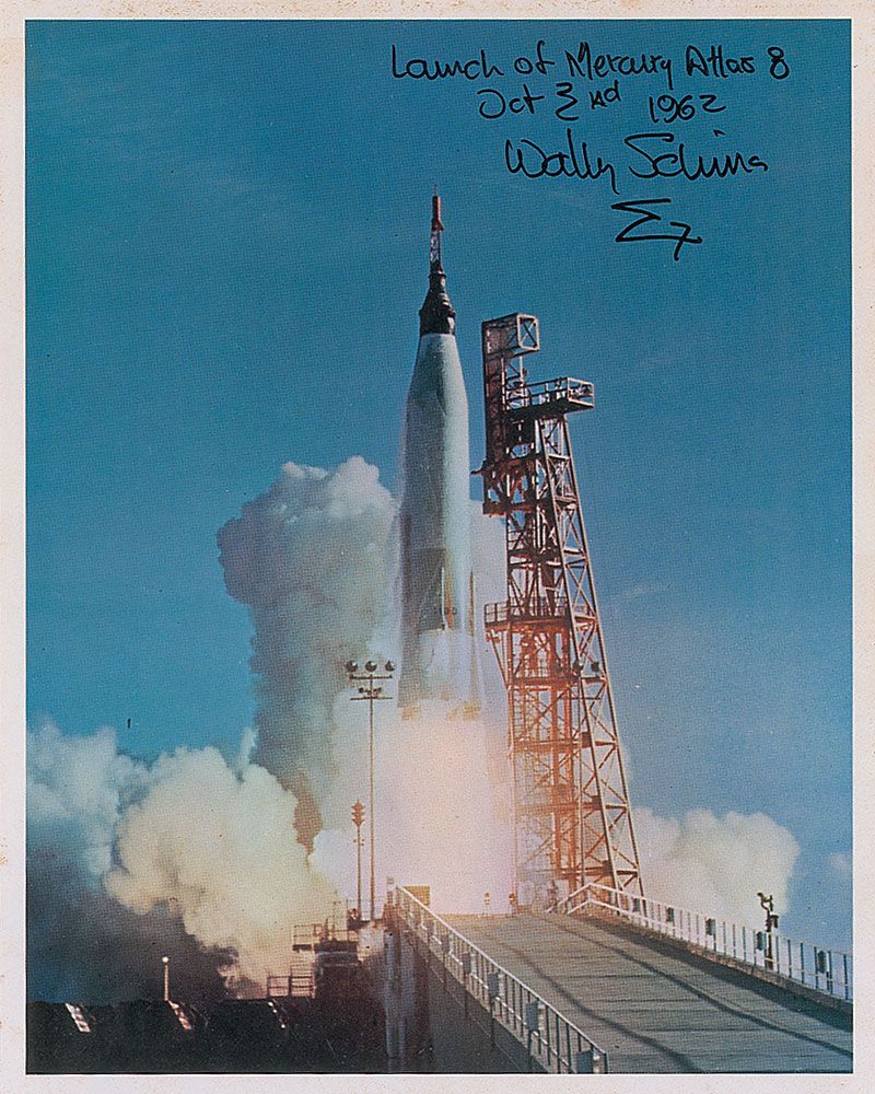 Color 8 x 10 NASA photo of Schirra’s rocket, signed in black felt tip, “Launch of Mercury Atlas 8, Oct. 3rd 1962, Wally Schirra,” adding his mission insignia underneath. In fine condition, with some scattered foxing to borders.