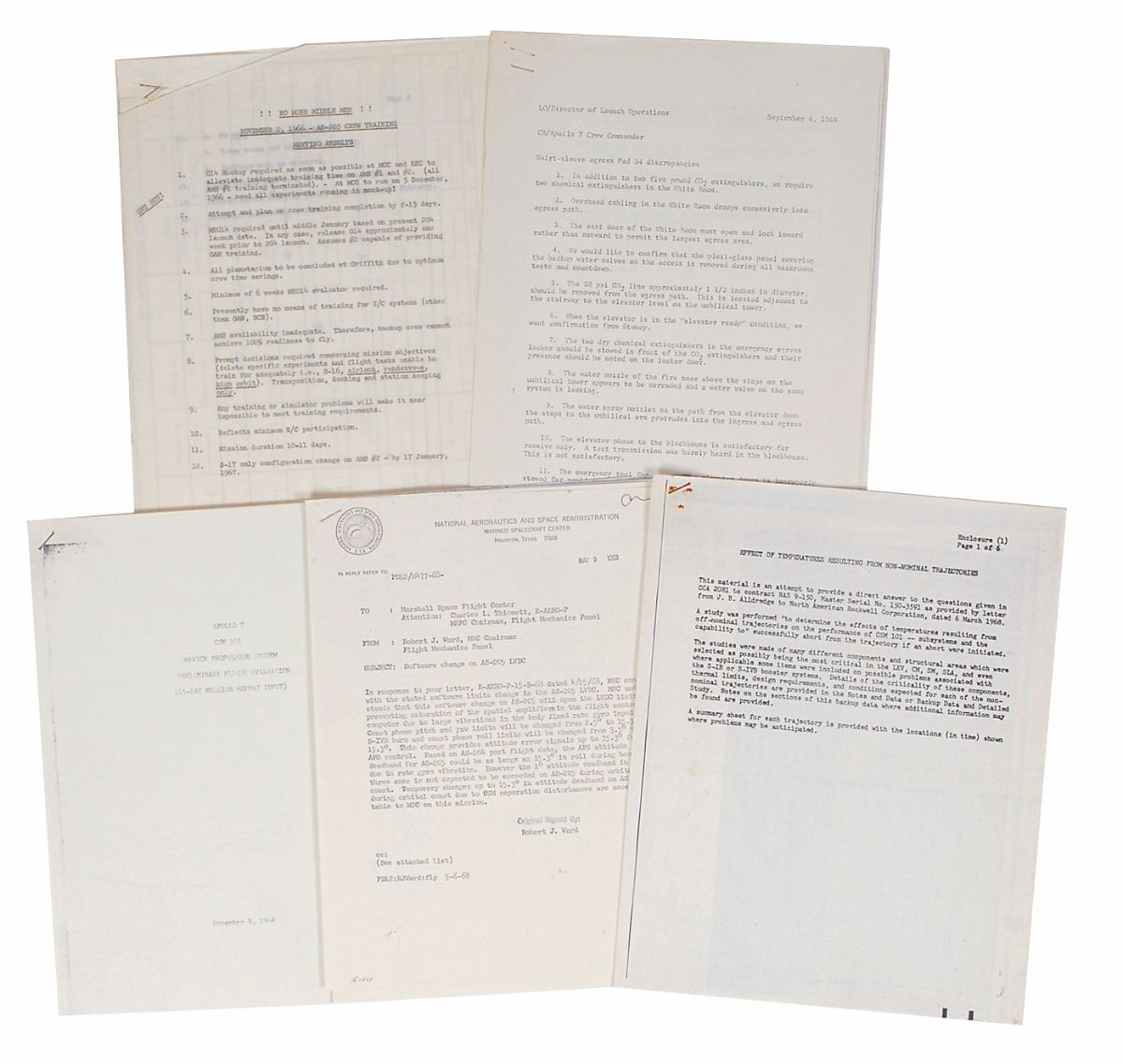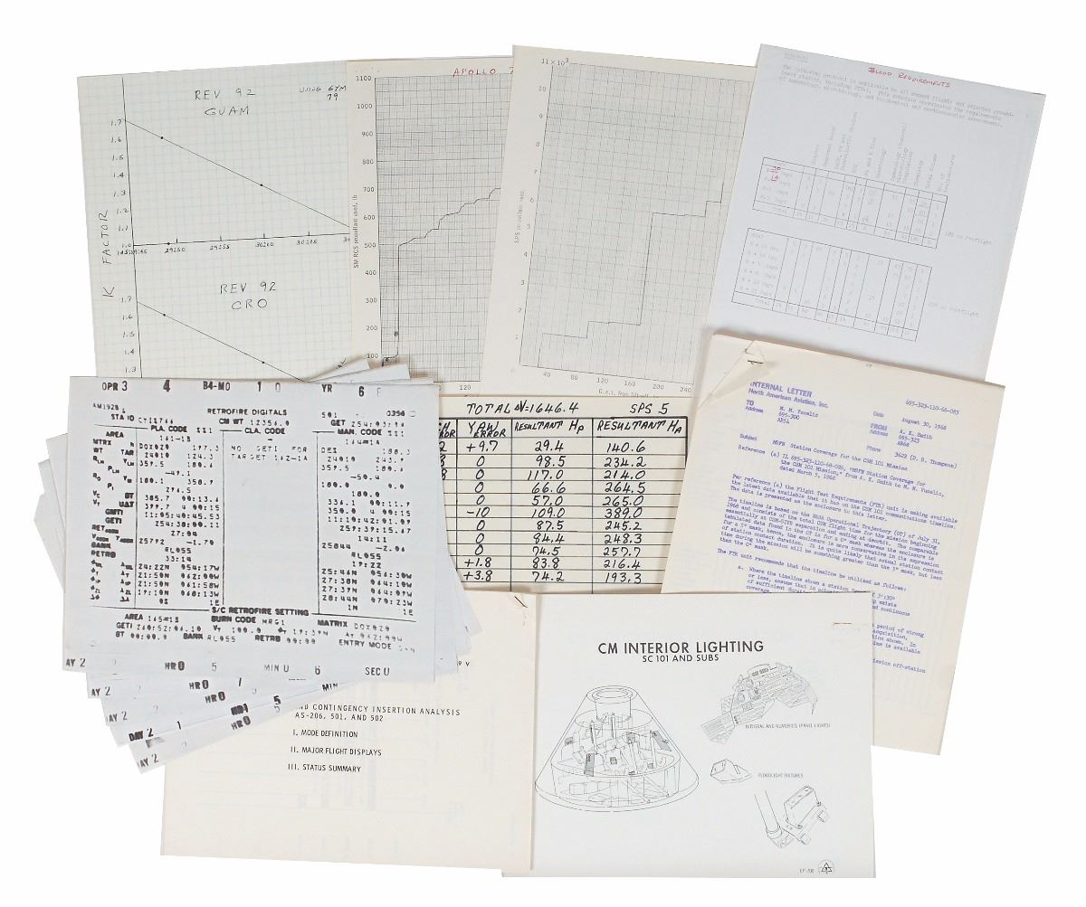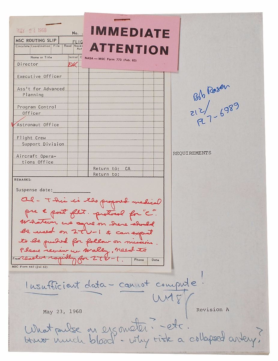 Interesting archive of Apollo documents, including: a packet entitled “Preflight and Postflight Medical Requirements, Apollo Mission C,” May 23, 1968, initialed and annotated at the bottom by Schirra, “Insufficient data—cannot compute! WMSJ, What pulse on ergometer?—etc., How much blood—why risk a collapsed artery?” An attached routing slip stamp-dated May 24, 1968, is initialed by Deke Slayton, “DK,” who writes below, “Al—this is the proposed medical pre & post flt. protocol for ‘C.’ Whatever we agree on here should be used…Please review w. Wally.” Also includes a few charts, a packet entitled “CM Interior Lighting,” “Mission Abort and Contingency Insertion Analysis,” a thick packet labeled “MSFN Station Coverage for the CSM 101 Mission,” and some additional internal memos and information regarding Apollo 7. In overall fine condition. Accompanied by a full letter of authenticity from Zarelli Space Authentication. A desirable collection of Apollo-related documents, highlighted by the first, pairing Schirra and Slayton.