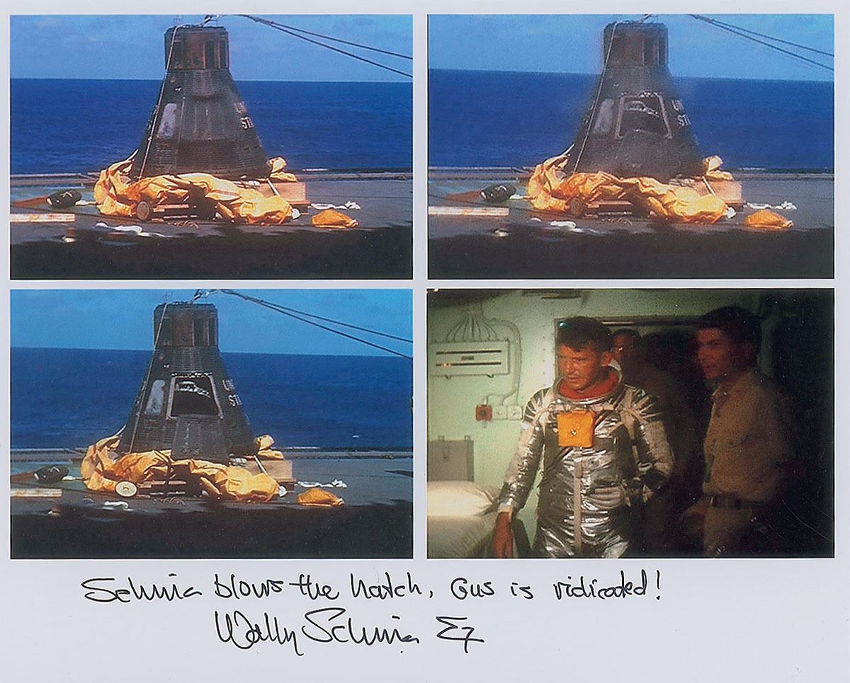 ALS, one page, 8.5 x 11, personal letterhead, no date. In full: “Instead of blaming newly designed equipment observers blamed Gus Grissom for blowing his hatch after his water landing. This caused the spacecraft to sink and almost cost Gus his life. I was almost badly hurt during a helicopter pick-up in training, and I decided to have Sigma 7, my Mercury spacecraft, hoisted onboard the carrier by a shipboard crane. A mattress was placed near the hatch of Sigma 7 permitting me to blow the hatch while on the flight deck. I hit the plunger, actuator with my right hand. The ‘switch’ was about two inches in diameter, and the recoil cut through my glove and cut my hand. Gus was thrilled to see the cut, the next day, on the carrier, and we all agreed there had been no marks on Gus after Libery Bell sank. Gus was vindicated.” In fine condition. Accompanied by a color satin-finish 10 x 8 composite photo of Schirra’s experiment with the hatch, signed in the lower border in black felt tip, “Schirra blows the hatch, Gus is vindicated! Wally Schirra,” adding his mission insignia next to his signature. Speculation over Grissom’s mishandling of the Liberty Bell 7 hatch was finally put to rest by fellow Mercury astronaut Schirra, whose experiment and subsequent hand injury during the Sigma 7 landing convinced NASA engineers that Grissom was indeed telling the truth, and that blame should be cast on the spacecraft’s faulty egress system.