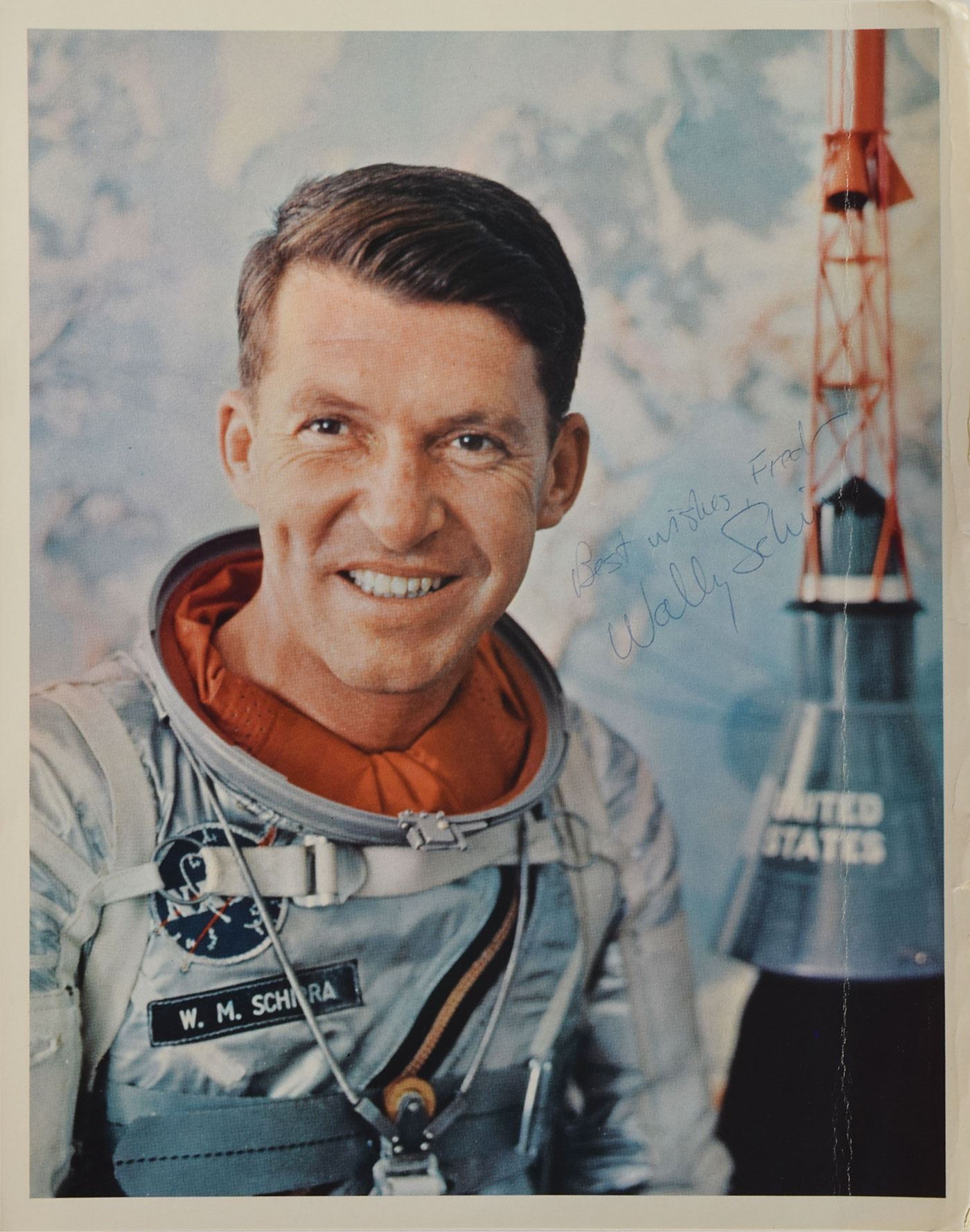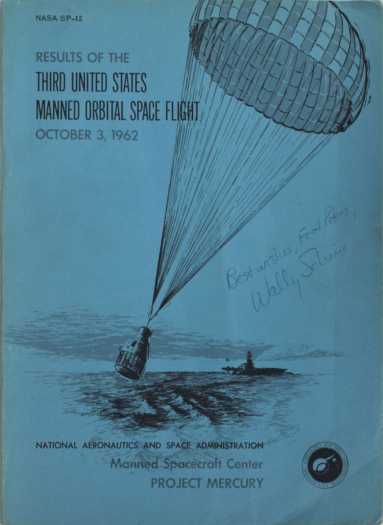 Two items: an official color 8 x 10 NASA lithograph of Schirra wearing his Mercury space suit with a capsule model in the background, signed and inscribed in black ballpoint, "Best wishes, Fred—, Wally Schirra"; and a softcover manual entitled Results of the Third United States Manned Orbital Space Flight, 120 pages, 7.75 x 10.25, October 3, 1962, signed and inscribed on the front cover in black ballpoint, "Best wishes, Fred Peters, Wally Schirra." In overall very good to fine condition, with light sunning to the manual's spine, and a heavy vertical crease to the right side of the signed photo.
