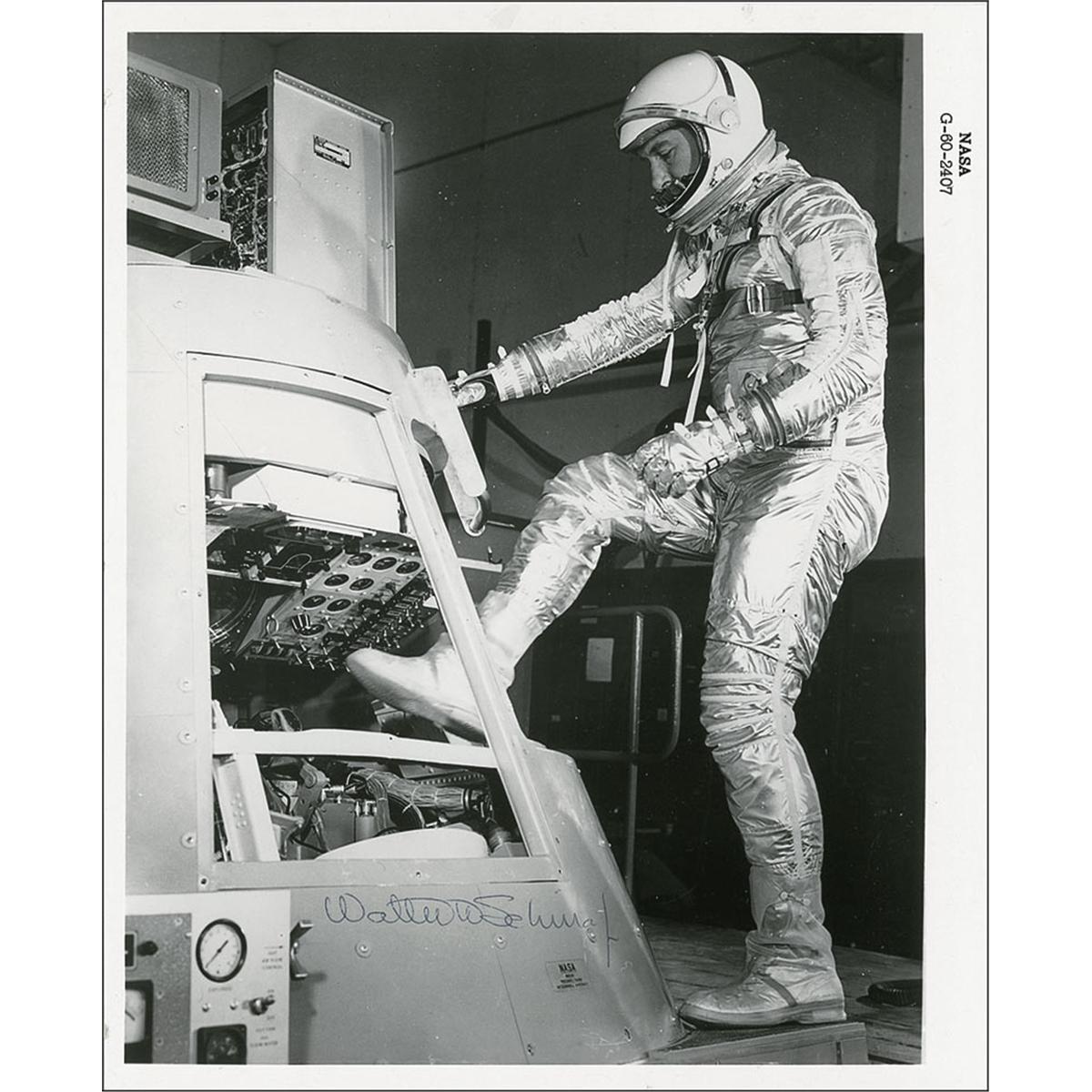 Glossy 8 x 10 photo of Schirra in his Mercury spacesuit entering his capsule, signed in blue ballpoint, “Walter M. Schirra, Jr.” Scattered light creases, surface marks, and impressions, otherwise fine condition.