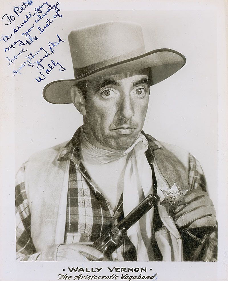 American comic and character actor (1905–1970). Vintage glossy 8 x 10 publicity photo of Vernon as ‘The Aristocratic Vagabond,’ signed and inscribed in blue ink, “To Pete, a swell guy, may you always have the best of everything. Your pal, Wally.” In fine condition, with some brushing and irregular adhesion to ink.