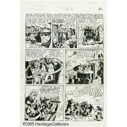 <B>Wally Wood - Frontline Combat #1, page 2 Original Art (EC, 1951).</B></I> From the tense Harvey Kurtzman-scripted "Unterseeboot 113," in which the war is seen from the perspective of an enemy submarine, comes this moody page by the great Wally Wood. Fabulous maritime details and Woody's trademark use of heavy black areas adds an aura of doom to the proceedings. Panels three and five were rendered on Craftint paper and pasted onto the board; the page is in Very Good condition, with a small tear in the top right corner and overall aging. The image area measures 13" x 18". A prime piece of EC art, by one of the all-time greats.
